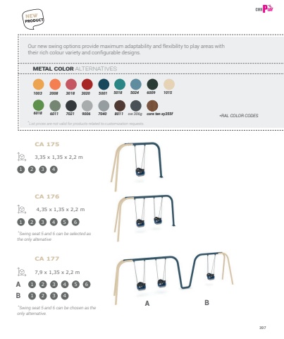3973,35 x 1,35 x 2,2 m 4,35 x 1,35 x 2,2 m *Swing seat 5 and 6 can be selected as the only altenative *Swing seat 5 and 6 can be chosen as the only alternative.7,9 x 1,35 x 2,2 mCA 175CA 176CA 17711112222333355444466AABBMETAL COLOR ALTERNATIVES1003*RAL COLOR CODES20083018302050015018702150249006600910156018601170408011sw 306gcore ten xy355fOur new swing options provide maximum adaptability and flexibility to play areas with their rich colour variety and configurable designs.*List prices are not valid for products related to customization requests.