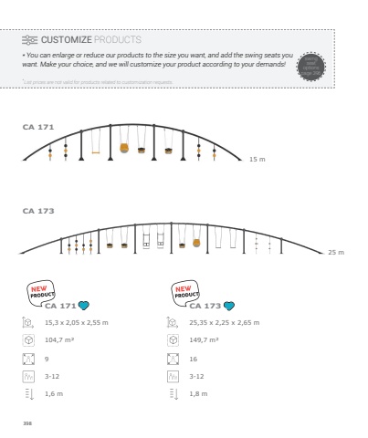 398CUSTOMIZE PRODUCTS* You can enlarge or reduce our products to the size you want, and add the swing seats you want. Make your choice, and we will customize your product according to your demands!15,3 x 2,05 x 2,55 m104,7 m%u00b293-121,6 mCA 171CA 171CA 17325,35 x 2,25 x 2,65 m149,7 m%u00b2163-121,8 m25 m15 mCA 173swing seat optionspage 396*List prices are not valid for products related to customization requests.