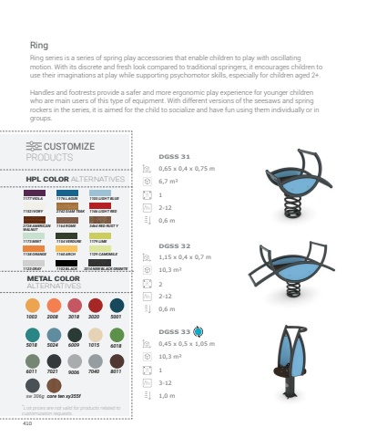 4100,65 x 0,4 x 0,75 m1,15 x 0,4 x 0,7 m0,45 x 0,5 x 1,05 m6,7 m%u00b210,3 m%u00b210,3 m%u00b21212-122-123-120,6 m0,6 m1,0 mDGSS 31DGSS 32DGSS 33Ring series is a series of spring play accessories that enable children to play with oscillating motion. With its discrete and fresh look compared to traditional springers, it encourages children to use their imaginations at play while supporting psychomotor skills, especially for children aged 2+. Handles and footrests provide a safer and more ergonomic play experience for younger children who are main users of this type of equipment. With different versions of the seesaws and spring rockers in the series, it is aimed for the child to socialize and have fun using them individually or in groups.RingCUSTOMIZE PRODUCTSHPL COLOR ALTERNATIVESMETAL COLOR ALTERNATIVES100320083018302050015018702150249006600910156018601170408011sw 306gcore ten xy355f*List prices are not valid for products related to customization requests.1152 IVORY1173 MINT1138 ORANGE1123 GRAY2728 AMER%u0130CAN WALNUT2742 SIAM TEAK1154 VERDURE1160 ARCH1102 BLACK1164 ROME1105 LIGHT BLUE1146 LIGHT RED1179 LIME1129 CAMOMILE3314 NEW BLACK GRANITE3464 RED RUST Y1177 VIOLA1176 LAGUN