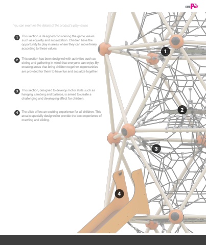9111234243This section is designed considering the game values such as equality and socialization. Children have the opportunity to play in areas where they can move freely according to these values.This section has been designed with activities such as sitting and gathering in mind that everyone can enjoy. By creating areas that bring children together, opportunities are provided for them to have fun and socialize together.The slide offers an exciting experience for all children. This area is specially designed to provide the best experience of crawling and sliding.This section, designed to develop motor skills such as hanging, climbing and balance, is aimed to create a challenging and developing effect for children.You can examine the details of the product%u2019s play values