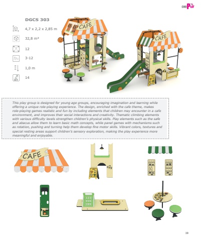 194,7 x 2,2 x 2,85 m32,8 m%u00b2123-121,0 m14DGCS 303This play group is designed for young age groups, encouraging imagination and learning while offering a unique role-playing experience. The design, enriched with the cafe theme, makes role-playing games realistic and fun by including elements that children may encounter in a cafe environment, and improves their social interactions and creativity. Thematic climbing elements with various difficulty levels strengthen children%u2019s physical skills. Play elements such as the safe and abacus allow them to learn basic math concepts, while panel games with mechanisms such as rotation, pushing and turning help them develop fine motor skills. Vibrant colors, textures and special resting areas support children%u2019s sensory exploration, making the play experience more meaningful and enjoyable.