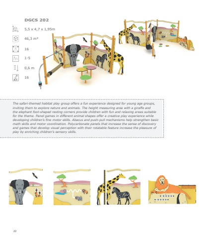 225,5 x 4,7 x 1,95m46,3 m%u00b2 161-50,6 m16DGCS 202The safari-themed habitat play group offers a fun experience designed for young age groups, inviting them to explore nature and animals. The height measuring area with a giraffe and the elephant foot-shaped resting corners provide children with fun and relaxing areas suitable for the theme. Panel games in different animal shapes offer a creative play experience while developing children%u2019s fine motor skills. Abacus and push-pull mechanisms help strengthen basic math skills and motor coordination. Polycarbonate panels that increase the sense of discovery and games that develop visual perception with their rotatable feature increase the pleasure of play by enriching children%u2019s sensory skills.