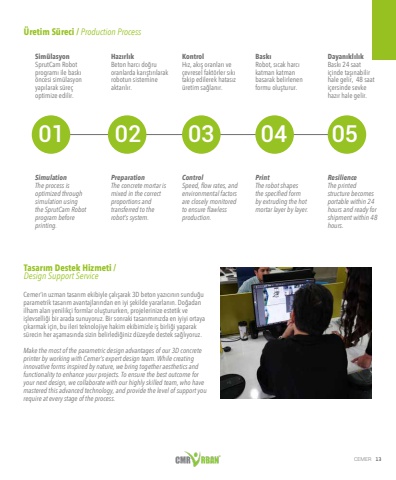 CEMER 13PreparationThe concrete mortar is mixed in the correct proportions and transferred to the robot%u2019s system.Haz%u0131rl%u0131k Beton harc%u0131 do%u011fru oranlarda kar%u0131%u015ft%u0131r%u0131larak robotun sistemine aktar%u0131l%u0131r.ResilienceThe printed structure becomes portable within 24 hours and ready for shipment within 48 hours.Dayan%u0131kl%u0131l%u0131kBask%u0131 24 saat i%u00e7inde ta%u015f%u0131nabilir hale gelir, 48 saat i%u00e7ersinde sevke haz%u0131r hale gelir.ControlSpeed, flow rates, and environmental factors are closely monitored to ensure flawless production.KontrolH%u0131z, ak%u0131%u015f oranlar%u0131 ve %u00e7evresel fakt%u00f6rler s%u0131k%u0131 takip edilerek hatas%u0131z %u00fcretim sa%u011flan%u0131r.SimulationThe process is optimized through simulation using the SprutCam Robot program before printing.Sim%u00fclasyonSprutCam Robot program%u0131 ile bask%u0131 %u00f6ncesi sim%u00fclasyon yap%u0131larak s%u00fcre%u00e7 optimize edilir.%u00dcretim S%u00fcreci / Production ProcessTasar%u0131m Destek Hizmeti /Design Support ServicePrintThe robot shapes the specified form by extruding the hot mortar layer by layer.Bask%u0131Robot, s%u0131cak harc%u0131 katman katman basarak belirlenen formu olu%u015fturur.01 02 03 04 05Cemer%u2019in uzman tasar%u0131m ekibiyle %u00e7al%u0131%u015farak 3D beton yaz%u0131c%u0131n%u0131n sundu%u011fu parametrik tasar%u0131m avantajlar%u0131ndan en iyi %u015fekilde yararlan%u0131n. Do%u011fadanilham alan yenilik%u00e7i formlar olu%u015ftururken, projelerinize estetik ve i%u015flevselli%u011fi bir arada sunuyoruz. Bir sonraki tasar%u0131m%u0131n%u0131zda en iyiyi ortaya %u00e7%u0131karmak i%u00e7in, bu ileri teknolojiye hakim ekibimizle i%u015f birli%u011fi yaparak s%u00fcrecin her a%u015famas%u0131nda sizin belirledi%u011finiz d%u00fczeyde destek sa%u011fl%u0131yoruz.Make the most of the parametric design advantages of our 3D concrete printer by working with Cemer%u2019s expert design team. While creating innovative forms inspired by nature, we bring together aesthetics and functionality to enhance your projects. To ensure the best outcome for your next design, we collaborate with our highly skilled team, who have mastered this advanced technology, and provide the level of support you require at every stage of the process.