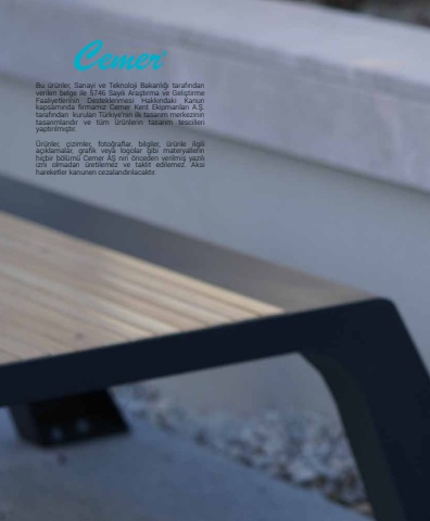%u201cdreams come true%u201dBu %u00fcr%u00fcnler, Sanayi ve Teknoloji Bakanl%u0131%u011f%u0131 taraf%u0131ndan verilen belge ile 5746 Say%u0131l%u0131 Ara%u015ft%u0131rma ve Geli%u015ftirme Faaliyetlerinin Desteklenmesi Hakk%u0131ndaki Kanun kapsam%u0131nda firmam%u0131z Cemer Kent Ekipmanlar%u0131 A.%u015e. taraf%u0131ndan kurulan T%u00fcrkiye%u2019nin ilk tasar%u0131m merkezinin tasar%u0131mlar%u0131d%u0131r ve t%u00fcm %u00fcr%u00fcnlerin tasar%u0131m tescilleri yapt%u0131r%u0131lm%u0131%u015ft%u0131r. %u00dcr%u00fcnler, %u00e7izimler, foto%u011fraflar, bilgiler, %u00fcr%u00fcnle ilgili a%u00e7%u0131klamalar, grafik veya logolar gibi materyallerin hi%u00e7bir b%u00f6l%u00fcm%u00fc Cemer A%u015e nin %u00f6nceden verilmi%u015f yaz%u0131l%u0131 izni olmadan %u00fcretilemez ve taklit edilemez. Aksi hareketler kanunen cezaland%u0131r%u0131lacakt%u0131r.