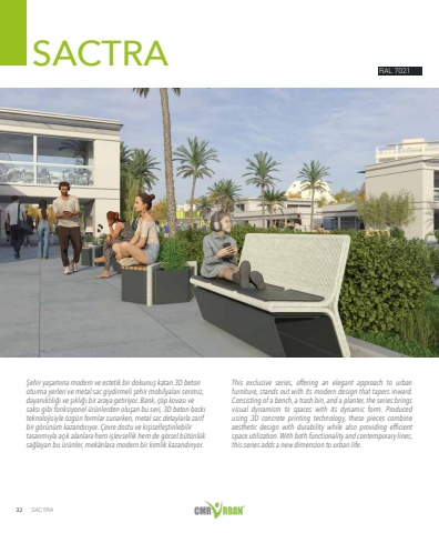 32 SACTRA%u015eehir ya%u015fam%u0131na modern ve estetik bir dokunu%u015f katan 3D beton oturma yerleri ve metal sac giydirmeli %u015fehir mobilyalar%u0131 serimiz,dayan%u0131kl%u0131l%u0131%u011f%u0131 ve %u015f%u0131kl%u0131%u011f%u0131 bir araya getiriyor. Bank, %u00e7%u00f6p kovas%u0131 ve saks%u0131 gibi fonksiyonel %u00fcr%u00fcnlerden olu%u015fan bu seri, 3D beton bask%u0131 teknolojisiyle %u00f6zg%u00fcn formlar sunarken, metal sac detaylarla zarif bir g%u00f6r%u00fcn%u00fcm kazand%u0131r%u0131yor. %u00c7evre dostu ve ki%u015fiselle%u015ftirilebilir tasar%u0131m%u0131yla a%u00e7%u0131k alanlara hem i%u015flevsellik hem de g%u00f6rsel b%u00fct%u00fcnl%u00fck sa%u011flayan bu %u00fcr%u00fcnler, mek%u00e2nlara modern bir kimlik kazand%u0131r%u0131yor.This exclusive series, offering an elegant approach to urban furniture, stands out with its modern design that tapers inward. Consisting of a bench, a trash bin, and a planter, the series brings visual dynamism to spaces with its dynamic form. Produced using 3D concrete printing technology, these pieces combine aesthetic design with durability while also providing efficient space utilization. With both functionality and contemporary lines, this series adds a new dimension to urban life.SACTRARAL 7021