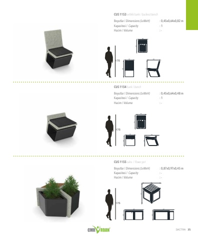 SACTRA 35Boyutlar / Dimensions (LxWxH)Kapasitesi / CapacityHacim / VolumeBoyutlar / Dimensions (LxWxH)Kapasitesi / CapacityHacim / VolumeCUS 1154 bank / benchCUS 1155 saks%u0131 / flower pot: 0,45x0,64x0,48 m: 1: -: 0,87x0,97x0,45 m: -: -Boyutlar / Dimensions (LxWxH)Kapasitesi / CapacityHacim / VolumeCUS 1153 s%u0131rtl%u0131kl%u0131 bank / backrest bench: 0,45x0,64x0,82 m: 1: -175456445826482175484564454864175459745879787
