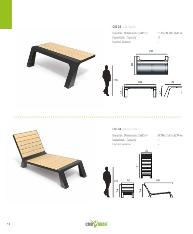 44Boyutlar / Dimensions (LxWxH)Kapasitesi / CapacityHacim / VolumeBoyutlar / Dimensions (LxWxH)Kapasitesi / CapacityHacim / VolumeCUS 03 bank / benchCUS 04 %u015fezlong/ sunbed: 1,35 x 0,78 x 0,45 m: 3: -: 0,70 x 1,61 x 0,74 m: 1: - 1751751357878454513570701611617474