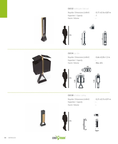 54 BERMUDABoyutlar / Dimensions (LxWxH)Kapasitesi / CapacityHacim / VolumeBoyutlar / Dimensions (LxWxH)Kapasitesi / CapacityHacim / VolumeCUS 54 %u00e7%u00f6p / binCUS 58 k%u00fcl tablas%u0131 / ashtray: 0,66 x 0,30 x 1,2 m: -: Max. 60 L: 0,31 x 0,15 x 0,91 m: -: - Boyutlar / Dimensions (LxWxH)Kapasitesi / CapacityHacim / VolumeCUS 52 bisiklet park%u0131 / bike rack: 0,17 x 0,16 x 0,87 m: 1: - 17517517517871687161766 30 30120 12066