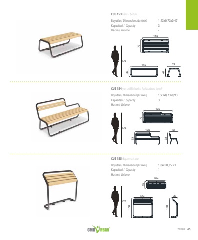 ZEBRA 65Boyutlar / Dimensions (LxWxH)Kapasitesi / CapacityHacim / VolumeBoyutlar / Dimensions (LxWxH)Kapasitesi / CapacityHacim / VolumeCUS 154 yar%u0131 s%u0131rtl%u0131kl%u0131 bank / half backrest benchCUS 155 dayanma / lean: 1,93x0,73x0,93: 3: -: 1,04 x 0,35 x 1: 1: -Boyutlar / Dimensions (LxWxH)Kapasitesi / CapacityHacim / VolumeCUS 153 bank / bench: 1,43x0,73x0,47: 3: -14314319319310435104 35100 100 9393 7373734747 73175175175