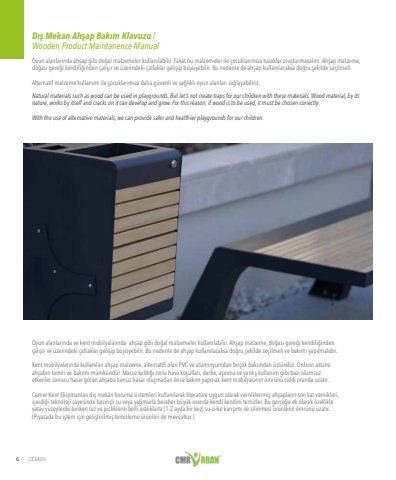 6 CEMERD%u0131%u015f Mekan Ah%u015fap Bak%u0131m Klavuzu / Wooden Product Maintanence ManualOyun alanlar%u0131nda ah%u015fap gibi do%u011fal malzemeler kullan%u0131labilir. Fakat bu malzemeler ile %u00e7ocuklar%u0131m%u0131za tuzaklar olu%u015fturmayal%u0131m. Ah%u015fap malzeme, do%u011fas%u0131 gere%u011fi kendili%u011finden %u00e7al%u0131%u015f%u0131r ve %u00fczerindeki %u00e7atlaklar geli%u015fip b%u00fcy%u00fcyebilir. Bu nedenle de ah%u015fap kullan%u0131lacaksa do%u011fru %u015fekilde se%u00e7ilmeli.Alternatif malzeme kullan%u0131m%u0131 ile %u00e7ocuklar%u0131m%u0131za daha g%u00fcvenli ve sa%u011fl%u0131kl%u0131 oyun alanlar%u0131 sa%u011flayabiliriz.Natural materials such as wood can be used in playgrounds. But let%u2019s not create traps for our children with these materials. Wood material, by its nature, works by itself and cracks on it can develop and grow. For this reason, if wood is to be used, it must be chosen correctly.With the use of alternative materials, we can provide safer and healthier playgrounds for our children.Oyun alanlar%u0131nda ve kent mobilyalar%u0131nda ah%u015fap gibi do%u011fal malzemeler kullan%u0131labilir. Ah%u015fap malzeme, do%u011fas%u0131 gere%u011fi kendili%u011finden %u00e7al%u0131%u015f%u0131r ve %u00fczerindeki %u00e7atlaklar geli%u015fip b%u00fcy%u00fcyebilir. Bu nedenle de ah%u015fap kullan%u0131lacaksa do%u011fru %u015fekilde se%u00e7ilmeli ve bak%u0131m%u0131 yap%u0131lmal%u0131d%u0131r.Kent mobilyalar%u0131nda kullan%u0131lan ah%u015fap malzeme, alternatifi olan PVC ve al%u00fcminyumdan bir%u00e7ok bak%u0131mdan %u00fcst%u00fcnd%u00fcr. Onlar%u0131n aksine ah%u015fab%u0131n tamiri ve bak%u0131m%u0131 m%u00fcmk%u00fcnd%u00fcr. Maruz kald%u0131%u011f%u0131 zorlu hava ko%u015fullar%u0131, darbe, a%u015f%u0131nma ve yanl%u0131%u015f kullan%u0131m gibi baz%u0131 olumsuz etkenler sonucu hasar g%u00f6ren ah%u015faba hen%u00fcz hasar olu%u015fmadan %u00f6nce bak%u0131m yapmak kent mobilyas%u0131n%u0131n %u00f6mr%u00fcn%u00fc ciddi oranda uzat%u0131r.Cemer Kent Ekipmanlar%u0131 d%u0131%u015f mek%u00e2n koruma sistemleri kullan%u0131larak literat%u00fcre uygun olarak verniklenmi%u015f ah%u015faplar%u0131n son kat vernikleri, i%u00e7erdi%u011fi teknoloji sayesinde bas%u0131n%u00e7l%u0131 su veya ya%u011fmurla beraber b%u00fcy%u00fck oranda kendi kendini temizler. Bu ger%u00e7e%u011fe ek olarak %u00f6zellikle yatay y%u00fczeylerde biriken toz ve pisliklerin belli aral%u0131klarla (1-2 ayda bir kez) su-sirke kar%u0131%u015f%u0131m%u0131 ile silinmesi %u00fcr%u00fcnlerin %u00f6mr%u00fcn%u00fc uzat%u0131r. (Piyasada bu i%u015flem i%u00e7in geli%u015ftirilmi%u015f temizleme %u00fcr%u00fcnleri de mevcuttur.)