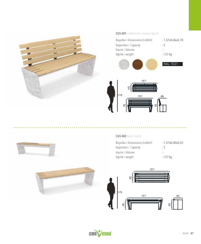9040 87RAL 7021Boyutlar / Dimensions (LxWxH)Kapasitesi / CapacityHacim / Volume A%u011f%u0131rl%u0131k / weightCUS 401 s%u0131rtl%u0131kl%u0131 bank / backrest bench: 1,57x0,46x0,78: 3: -: 137 kgBoyutlar / Dimensions (LxWxH)Kapasitesi / CapacityHacim / Volume A%u011f%u0131rl%u0131k / weightCUS 402 bank / bench: 1,57x0,40x0,43: 3: -: 137 kg175175157157 46467878157157 40404343