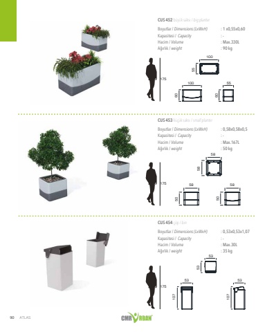 90 ATLASBoyutlar / Dimensions (LxWxH)Kapasitesi / CapacityHacim / Volume A%u011f%u0131rl%u0131k / weightBoyutlar / Dimensions (LxWxH)Kapasitesi / CapacityHacim / Volume A%u011f%u0131rl%u0131k / weightCUS 453 k%u00fc%u00e7%u00fck saks%u0131 / small planterCUS 454 %u00e7%u00f6p / bin: 0,58x0,58x0,5: -: Max.167L: 50 kg: 0,53x0,53x1,07: -: Max.30L: 35 kgBoyutlar / Dimensions (LxWxH)Kapasitesi / CapacityHacim / Volume A%u011f%u0131rl%u0131k / weightCUS 452 b%u00fcy%u00fck saks%u0131 / big planter: 1 x0,55x0,60: -: Max.330L: 90 kg1751751751005858 58 585050100555560605353 53 53107 107
