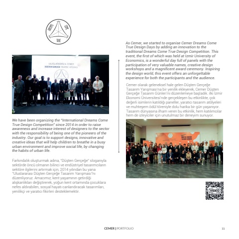 CEMER | PORTFOLIO 11We have been organizing the %u201cInternational Dreams Come True Design Competition%u201d since 2014 in order to raise awareness and increase interest of designers to the sector with the responsibility of being one of the pioneers of the industry. Our goal is to support designs, innovative and creative ideas that will help children to breathe in a busy urban environment and improve social life, by changing the habits of urban life.Fark%u0131ndal%u0131k olu%u015fturmak ad%u0131na, %u201cD%u00fc%u015ften Ger%u00e7e%u011fe%u201d slogan%u0131yla sekt%u00f6rde %u00f6nc%u00fc olman%u0131n bilinci ve end%u00fcstriyel tasar%u0131mc%u0131lar%u0131n sekt%u00f6re ilgilerini art%u0131rmak i%u00e7in, 2014 y%u0131l%u0131ndan bu yana %u201cUluslararas%u0131 D%u00fc%u015ften Ger%u00e7e%u011fe Tasar%u0131m Yar%u0131%u015fmas%u0131%u201dn%u0131 d%u00fczenliyoruz. Amac%u0131m%u0131z; kent ya%u015fam%u0131n%u0131n getirdi%u011fi al%u0131%u015fkanl%u0131klar%u0131 de%u011fi%u015ftirerek, yo%u011fun kent ortam%u0131nda %u00e7ocuklara nefes ald%u0131rabilen, sosyal hayat%u0131 canland%u0131racak tasar%u0131mlar%u0131, yenilik%u00e7i ve yarat%u0131c%u0131 fikirleri desteklemektir.As Cemer, we started to organise Cemer Dreams Come True Design Days by adding an innovation to the traditional Dreams Come True Design Competition. This event, the first of which was held at Izmir University of Economics, is a wonderful day full of panels with the participation of very valuable names, creative design workshops and a magnificent award ceremony. Inspiring the design world, this event offers an unforgettable experience for both the participants and the audience.Cemer olarak geleneksel hale gelen D%u00fc%u015ften Ger%u00e7e%u011fe Tasar%u0131m Yar%u0131%u015fmas%u0131%u2019na bir yenilik ekleyerek, Cemer D%u00fc%u015ften Ger%u00e7e%u011fe Tasar%u0131m G%u00fcnleri%u2019ni d%u00fczenlemeye ba%u015flad%u0131k. ilki %u0130zmir Ekonomi %u00dcniversitesi%u2019nde ger%u00e7ekle%u015fen bu etkinlikte, %u00e7ok de%u011ferli isimlerin kat%u0131ld%u0131%u011f%u0131 paneller, yarat%u0131c%u0131 tasar%u0131m at%u00f6lyeleri ve muhte%u015fem %u00f6d%u00fcl t%u00f6reniyle dolu harika bir g%u00fcn ya%u015fan%u0131yor. Tasar%u0131m d%u00fcnyas%u0131na ilham veren bu etkinlik, hem kat%u0131l%u0131mc%u0131lar hem de izleyiciler i%u00e7in unutulmaz bir deneyim sunuyor.