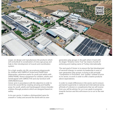 CEMER | PORTFOLIO 3scope, we design and manufactures the products which will conturibute to socialization of every age group and help to their development of muscle and coordination system.For a high-quality city life; we produces playgrounds for children with CMRPLAY brand and Parkfit Kent Ekipmanlar%u0131, adventure parks for youth and adults with CMRXTREME, fitness equipment for children, adults and handicapped with CMRACTIVE and city furniture with CMRURBAN brand.Cemer acts in accordance with the objective in order to revive the social life by creating amusing and healthy areas for youth, adults and handicapped citizens besides children through products which are designed based on safety.In its own sector, it makes a distinguished name for oneself in Turkey and around the world with its newgeneration play groups in the path where it took with its slogan %u201cDreams Come True%u201d by means of pride of achieving and making name of Turkey internationally.The next goal of Cemer is to ensure the fast development of sectoral change, to sustain its leadership in area of new-generation play groups, to bring in the principle %u201cCompetition in Innovation and Quality%u201d instead of price to its sector, to work in order to offer creative products above expectations.In order to create differences in the sector and to ensure permanent superiority in national and international arena, all kinds of criticism or compliments that we will receive from you will be advisor for us in our goals to progress towards horizon and this will ensure us to run to the new goalsARMED ROPE & NET CLIMBERS PRODUCTIONROTATIONAL MOLDING DEPARTMENTADMINISTRATIVE BUILDINGDESIGN OFFICEPROTOTYPEPRODUCTIONCNC PROCESSINGCENTERSHOWROOMMETAL WORK WELDINGAREARECYCLABLE MATERIAL AREAS H I P M E N T AREAWOOD AND COMPOSITE PROCESSING CENTER