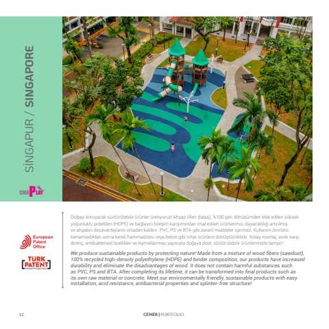 52 CEMER | PORTFOLIO S%u0130NGAPUR / SINGAPORECMR P LAYDo%u011fay%u0131 koruyarak s%u00fcrd%u00fcr%u00fclebilir %u00fcr%u00fcnler %u00fcretiyoruz! Ah%u015fap lifleri (tala%u015f), %100 geri d%u00f6n%u00fc%u015f%u00fcmden elde edilen y%u00fcksek yo%u011funluklu polietilen (HDPE) ve ba%u011flay%u0131c%u0131 bile%u015fim kar%u0131%u015f%u0131m%u0131ndan imal edilen %u00fcr%u00fcnlerimiz, dayan%u0131kl%u0131l%u0131%u011f%u0131 art%u0131r%u0131lm%u0131%u015f ve ah%u015fab%u0131n dezavantajlar%u0131n%u0131 ortadan kald%u0131r%u0131r. PVC, PS ve BTA gibi zararl%u0131 maddeler i%u00e7ermez. Kullan%u0131m %u00f6mr%u00fcn%u00fc tamamlad%u0131ktan sonra kendi hammaddesi veya beton gibi nihai %u00fcr%u00fcnlere d%u00f6n%u00fc%u015ft%u00fcr%u00fclebilir. Kolay montaj, asite kar%u015f%u0131 diren%u00e7, antibakteriyel %u00f6zellikler ve k%u0131ym%u0131klanmaz yap%u0131s%u0131yla do%u011faya dost, s%u00fcrd%u00fcr%u00fclebilir %u00fcr%u00fcnlerimizle tan%u0131%u015f%u0131n!We produce sustainable products by protecting nature! Made from a mixture of wood fibers (sawdust), 100% recycled high-density polyethylene (HDPE) and binder composition, our products have increased durability and eliminate the disadvantages of wood. It does not contain harmful substances such as PVC, PS and BTA. After completing its lifetime, it can be transformed into final products such as its own raw material or concrete. Meet our environmentally friendly, sustainable products with easy installation, acid resistance, antibacterial properties and splinter-free structure!