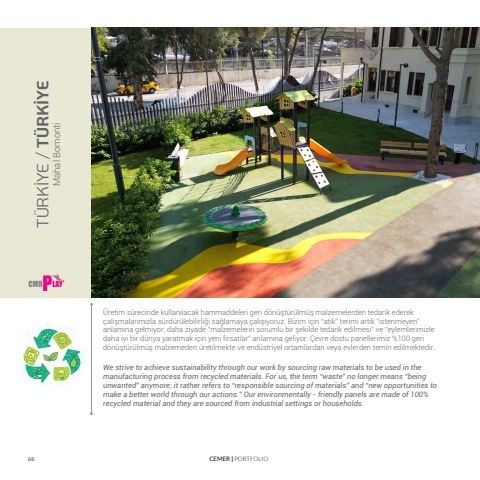 66 CEMER | PORTFOLIO T%u00dcRK%u0130YE / T%u00dcRK%u0130YE Mahal BomontiCMR P LAY%u00dcretim s%u00fcrecinde kullan%u0131lacak hammaddeleri geri d%u00f6n%u00fc%u015ft%u00fcr%u00fclm%u00fc%u015f malzemelerden tedarik ederek %u00e7al%u0131%u015fmalar%u0131m%u0131zla s%u00fcrd%u00fcr%u00fclebilirli%u011fi sa%u011flamaya %u00e7al%u0131%u015f%u0131yoruz. Bizim i%u00e7in %u201cat%u0131k%u201d terimi art%u0131k %u201cistenmeyen%u201d anlam%u0131na gelmiyor; daha ziyade %u201cmalzemelerin sorumlu bir %u015fekilde tedarik edilmesi%u201d ve %u201ceylemlerimizle daha iyi bir d%u00fcnya yaratmak i%u00e7in yeni f%u0131rsatlar%u201d anlam%u0131na geliyor. %u00c7evre dostu panellerimiz %100 geri d%u00f6n%u00fc%u015ft%u00fcr%u00fclm%u00fc%u015f malzemeden %u00fcretilmekte ve end%u00fcstriyel ortamlardan veya evlerden temin edilmektedir. We strive to achieve sustainability through our work by sourcing raw materials to be used in the manufacturing process from recycled materials. For us, the term %u201cwaste%u201d no longer means %u201cbeing unwanted%u201d anymore; it rather refers to %u201cresponsible sourcing of materials%u201d and %u201cnew opportunities to make a better world through our actions.%u201d Our environmentally - friendly panels are made of 100% recycled material and they are sourced from industrial settings or households.