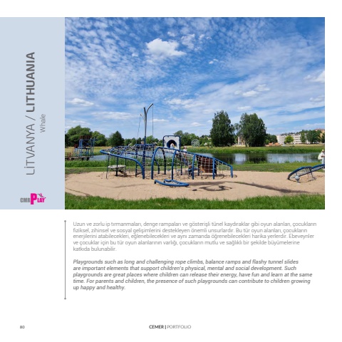 80 CEMER | PORTFOLIOUzun ve zorlu ip t%u0131rmanmalar%u0131, denge rampalar%u0131 ve g%u00f6steri%u015fli t%u00fcnel kayd%u0131raklar gibi oyun alanlar%u0131, %u00e7ocuklar%u0131n fiziksel, zihinsel ve sosyal geli%u015fimlerini destekleyen %u00f6nemli unsurlard%u0131r. Bu t%u00fcr oyun alanlar%u0131, %u00e7ocuklar%u0131n enerjilerini atabilecekleri, e%u011flenebilecekleri ve ayn%u0131 zamanda %u00f6%u011frenebilecekleri harika yerlerdir. Ebeveynler ve %u00e7ocuklar i%u00e7in bu t%u00fcr oyun alanlar%u0131n%u0131n varl%u0131%u011f%u0131, %u00e7ocuklar%u0131n mutlu ve sa%u011fl%u0131kl%u0131 bir %u015fekilde b%u00fcy%u00fcmelerine katk%u0131da bulunabilir.Playgrounds such as long and challenging rope climbs, balance ramps and flashy tunnel slides are important elements that support children%u2019s physical, mental and social development. Such playgrounds are great places where children can release their energy, have fun and learn at the same time. For parents and children, the presence of such playgrounds can contribute to children growing up happy and healthy.L%u0130TVANYA / LITHUANIA WhaleCMR P LAY