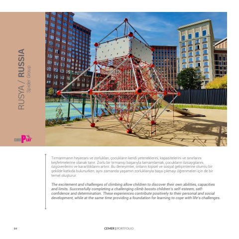 84 CEMER | PORTFOLIOT%u0131rmanman%u0131n heyecan%u0131 ve zorluklar%u0131, %u00e7ocuklar%u0131n kendi yeteneklerini, kapasitelerini ve s%u0131n%u0131rlar%u0131n%u0131 ke%u015ffetmelerine olanak tan%u0131r. Zorlu bir t%u0131rman%u0131%u015f%u0131 ba%u015far%u0131yla tamamlamak, %u00e7ocuklar%u0131n %u00f6zsayg%u0131lar%u0131n%u0131, %u00f6zg%u00fcvenlerini ve kararl%u0131l%u0131klar%u0131n%u0131 art%u0131r%u0131r. Bu deneyimler, onlar%u0131n ki%u015fisel ve sosyal geli%u015fimlerine olumlu bir %u015fekilde katk%u0131da bulunurken, ayn%u0131 zamanda ya%u015fam%u0131n zorluklar%u0131yla ba%u015fa %u00e7%u0131kmay%u0131 %u00f6%u011frenmeleri i%u00e7in de bir temel olu%u015fturur.The excitement and challenges of climbing allow children to discover their own abilities, capacities and limits. Successfully completing a challenging climb boosts children%u2019s self-esteem, selfconfidence and determination. These experiences contribute positively to their personal and social development, while at the same time providing a foundation for learning to cope with life%u2019s challenges.RUSYA / RUSSIACMR P LAYSpider Group