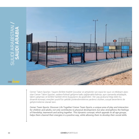 88 CEMER | PORTFOLIOCemer Tak%u0131m Sporlar%u0131: Ya%u015fam%u0131 Birlikte Ke%u015ffet! %u00c7ocuklar ve yeti%u015fkinler i%u00e7in e%u015fsiz bir oyun ve etkile%u015fim alan%u0131 olan Cemer Tak%u0131m Sporlar%u0131, sadece fiziksel geli%u015fime katk%u0131 sa%u011flamakla kalmaz; ayn%u0131 zamanda arkada%u015fl%u0131k, tak%u0131m %u00e7al%u0131%u015fmas%u0131 ve birlikte hareket etme duygular%u0131n%u0131 da g%u00fc%u00e7lendirir. Her ya%u015f grubuna hitap eden bu dinamik konsept, enerjileri pozitif bir %u015fekilde y%u00f6nlendirmelerine yard%u0131mc%u0131 olurken, sosyal becerilerini de geli%u015ftirmelerine olanak tan%u0131r.Cemer Team Sports: Discover Life Together! Cemer Team Sports, a unique area of play and interaction for children and adults, not only contributes to physical development, but also strengthens the feelings of friendship, teamwork and acting together. This dynamic concept, which appeals to all age groups, helps them channel their energies in a positive way, while allowing them to develop their social skills.SUUD%u0130 ARAB%u0130STAN / SAUDI ARABIA