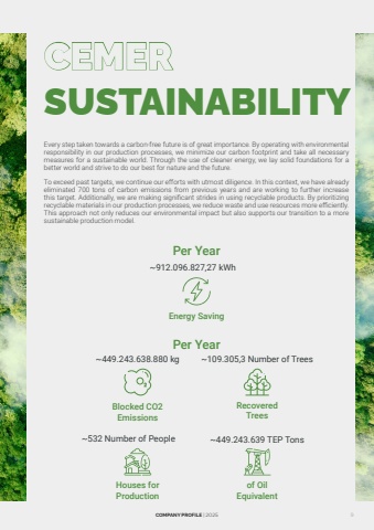 Every step taken towards a carbon-free future is of great importance. By operating with environmental responsibility in our production processes, we minimize our carbon footprint and take all necessary measures for a sustainable world. Through the use of cleaner energy, we lay solid foundations for a better world and strive to do our best for nature and the future. To exceed past targets, we continue our efforts with utmost diligence. In this context, we have already eliminated 700 tons of carbon emissions from previous years and are working to further increase this target. Additionally, we are making significant strides in using recyclable products. By prioritizing recyclable materials in our production processes, we reduce waste and use resources more efficiently. This approach not only reduces our environmental impact but also supports our transition to a more sustainable production model. Per YearPer YearEnergy SavingBlocked CO2EmissionsRecoveredTreesHouses forProductionof OilEquivalentCEMERSUSTAINABILITY~912.096.827,27 kWh~449.243.638.880 kg~109.305,3 Number of Trees~532 Number of People~449.243.639 TEP TonsCOMPANY PROFILE | 20259