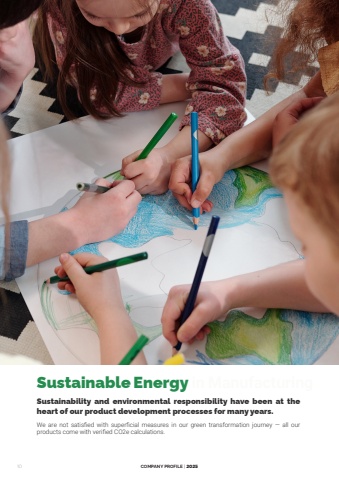 10COMPANY PROFILE | 2025Sustainability and environmental responsibility have been at the heart of our product development processes for many years.We are not satisfied with superficial measures in our green transformation journey %u2014 all our products come with verified CO2e calculations.Sustainable Energy in Manufacturing