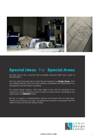 COMPANY PROFILE | 202527Special Ideas For Special AreasWe take care to be a structure that constantly improves itself and is open to transformation. All of our series that add color to urban life are created by our Design Center. All of our catalog products, which we mass produce, are planned and implemented in a field-specific way with Cemer%u2019s signature.Our special design projects, which take shape in line with the demands of our customers, include a sensitive process in which our team works in coordination as a whole under our CMRIDEA%u00ae brand.We aim to support a multidisciplinary working environment with our large team. Thanks to our friends in our team, we develop new projects in accordance with the dream of tomorrow and the reality of today.
