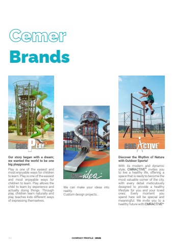 30COMPANY PROFILE | 2025Our story began with a dream; we wanted the world to be one big playground.Play is one of the easiest and most enjoyable ways for children to learn. Play is one of the easiest and most enjoyable ways for children to learn. Play allows the child to learn by experience and actually doing things. Through play, children learn naturally and play teaches kids different ways of expressing themselves.We can make your ideas into reality.Custom design projects...Discover the Rhythm of Nature with Outdoor Sports!With its modern and dynamic style, CMRACTIVE%u00ae invites you to live a healthy life, offering a space that is ready to become the most valuable corner of the city, with every detail meticulously designed to provide a healthy lifestyle for you and your loved ones. Every moment you spend here will be special and meaningful. We invite you to a healthy future with CMRACTIVE%u00ae.Cemer Brands