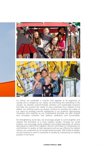 COMPANY PROFILE | 20257As Cemer, we undertake a mission that appeals to all segments of society and is shaped by our values. By prioritising the well-being of the society, we develop environmentally sensitive and sustainable products that take into account the needs of every individual from children to the elderly. we continue yerine we always continue to prioritise the safety of our users by avoiding harmful substances in our products. Recognising innovation and creativity as our fundamental principle, we offer original and innovative solutions that balance aesthetics and functionality.By strengthening social ties, we encourage people to come together and support the formation of a more resilient society. Through our social projects, we encourage social solidarity and enable individuals of various age groups to spend time together. We are committed to maintaining our commitment to quality at high standards and we see offering the highest value to our customers as our fundamental principle. With these principles, we will continue to work to contribute to society by maintaining our leading position in the future.