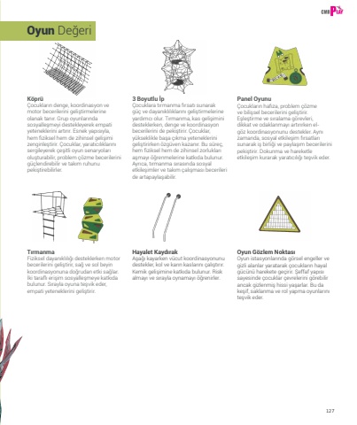 127K%u00f6pr%u00fc%u00c7ocuklar%u0131n denge, koordinasyon ve motor becerilerini geli%u015ftirmelerine olanak tan%u0131r. Grup oyunlar%u0131nda sosyalle%u015fmeyi destekleyerek empati yeteneklerini art%u0131r%u0131r. Esnek yap%u0131s%u0131yla, hem fiziksel hem de zihinsel geli%u015fimi zenginle%u015ftirir. %u00c7ocuklar, yarat%u0131c%u0131l%u0131klar%u0131n%u0131 sergileyerek %u00e7e%u015fitli oyun senaryolar%u0131 olu%u015fturabilir, problem %u00e7%u00f6zme becerilerini g%u00fc%u00e7lendirebilir ve tak%u0131m ruhunu peki%u015ftirebilirler.Oyun De%u011feriPanel Oyunu %u00c7ocuklar%u0131n haf%u0131za, problem %u00e7%u00f6zme ve bili%u015fsel becerilerini geli%u015ftirir. E%u015fle%u015ftirme ve s%u0131ralama g%u00f6revleri, dikkat ve odaklanmay%u0131 art%u0131r%u0131rken elg%u00f6z koordinasyonunu destekler. Ayn%u0131 zamanda, sosyal etkile%u015fim f%u0131rsatlar%u0131 sunarak i%u015f birli%u011fi ve payla%u015f%u0131m becerilerini peki%u015ftirir. Dokunma ve hareketle etkile%u015fim kurarak yarat%u0131c%u0131l%u0131%u011f%u0131 te%u015fvik eder. Oyun G%u00f6zlem Noktas%u0131Oyun istasyonlar%u0131nda g%u00f6rsel engeller ve gizli alanlar yaratarak %u00e7ocuklar%u0131n hayal g%u00fcc%u00fcn%u00fc harekete ge%u00e7irir. %u015eeffaf yap%u0131s%u0131 sayesinde %u00e7ocuklar %u00e7evrelerini g%u00f6rebilir ancak gizlenmi%u015f hissi ya%u015farlar. Bu da ke%u015fif, saklanma ve rol yapma oyunlar%u0131n%u0131 te%u015fvik eder. Hayalet Kayd%u0131rakA%u015fa%u011f%u0131 kayarken v%u00fccut koordinasyonunu destekler, kol ve kar%u0131n kaslar%u0131n%u0131 %u00e7al%u0131%u015ft%u0131r%u0131r. Kemik geli%u015fimine katk%u0131da bulunur. Risk almay%u0131 ve s%u0131rayla oynamay%u0131 %u00f6%u011frenirler.T%u0131rmanmaFiziksel dayan%u0131kl%u0131l%u0131%u011f%u0131 desteklerken motor becerilerini geli%u015ftirir, sa%u011f ve sol beyin koordinasyonuna do%u011frudan etki sa%u011flar. %u0130ki tarafl%u0131 eri%u015fim sosyalle%u015fmeye katk%u0131da bulunur. S%u0131rayla oyuna te%u015fvik eder, empati yeteneklerini geli%u015ftirir. 3 Boyutlu %u0130p%u00c7ocuklara t%u0131rmanma f%u0131rsat%u0131 sunarak g%u00fc%u00e7 ve dayan%u0131kl%u0131l%u0131klar%u0131n%u0131 geli%u015ftirmelerine yard%u0131mc%u0131 olur. T%u0131rmanma, kas geli%u015fimini desteklerken, denge ve koordinasyon becerilerini de peki%u015ftirir. %u00c7ocuklar, y%u00fckseklikle ba%u015fa %u00e7%u0131kma yeteneklerini geli%u015ftirirken %u00f6zg%u00fcven kazan%u0131r. Bu s%u00fcre%u00e7, hem fiziksel hem de zihinsel zorluklar%u0131 a%u015fmay%u0131 %u00f6%u011frenmelerine katk%u0131da bulunur. Ayr%u0131ca, t%u0131rmanma s%u0131ras%u0131nda sosyal etkile%u015fimler ve tak%u0131m %u00e7al%u0131%u015fmas%u0131 becerileri de artapayla%u015fabilir.