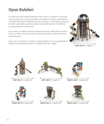 14%u00c7ocuklar i%u00e7in %u00f6zel olarak tasarlanan oyun evleri, rol yapma ve dramatik oyun deneyimleri sunarak %u00e7ocuklar%u0131n dil geli%u015fimini, ileti%u015fim yeteneklerini ve bili%u015fsel becerilerini destekler. Bu oyun alanlar%u0131, ev konseptine dayanan temalar%u0131 sayesinde %u00e7ocuklara g%u00fcnl%u00fck sosyal etkile%u015fimleri modelleme ve zenginle%u015ftirme imk%u00e2n%u0131 tan%u0131r. Oyun evleri, %u00e7ocuklar%u0131n ger%u00e7ek hayattaki durumlar%u0131 taklit ederek empati kurma, problem %u00e7%u00f6zme ve yarat%u0131c%u0131 d%u00fc%u015f%u00fcnme yetilerini geli%u015ftirmelerine katk%u0131da bulunur. Ayr%u0131ca, bu t%u00fcr ortamlar, %u00e7ocuklar%u0131n sosyal ili%u015fkiler kurma ve g%u00fc%u00e7lendirme s%u00fcre%u00e7lerini destekleyen g%u00fcvenli ve e%u011flenceli bir alan sa%u011flar.CDP 101-P / sayfa 59 CDP 105-P / sayfa 77 AGFS 210-P / sayfa 245AGFS 251-P / sayfa 252 AGFS 253-P / sayfa 258Oyun KuleleriCDP 103-P / sayfa 71AGFS 207-P / sayfa 246