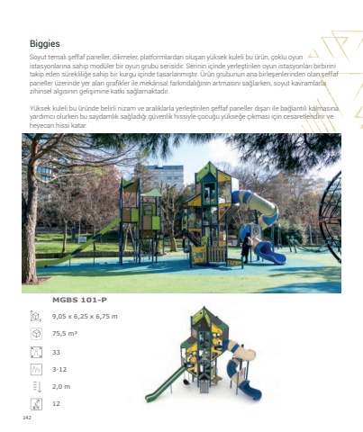 142Soyut temal%u0131 %u015feffaf paneller, dikmeler, platformlardan olu%u015fan y%u00fcksek kuleli bu %u00fcr%u00fcn, %u00e7oklu oyun istasyonlar%u0131na sahip mod%u00fcler bir oyun grubu serisidir. Serinin i%u00e7inde yerle%u015ftirilen oyun istasyonlar%u0131 birbirini takip eden s%u00fcreklili%u011fe sahip bir kurgu i%u00e7inde tasarlanm%u0131%u015ft%u0131r. %u00dcr%u00fcn grubunun ana birle%u015fenlerinden olan %u015feffaf paneller %u00fczerinde yer alan grafikler ile mek%u00e2nsal fark%u0131ndal%u0131%u011f%u0131n%u0131n artmas%u0131n%u0131 sa%u011flarken, soyut kavramlarla zihinsel alg%u0131s%u0131n%u0131n geli%u015fimine katk%u0131 sa%u011flamaktad%u0131r. Y%u00fcksek kuleli bu %u00fcr%u00fcnde belirli nizam ve aral%u0131klarla yerle%u015ftirilen %u015feffaf paneller d%u0131%u015far%u0131 ile ba%u011flant%u0131l%u0131 kalmas%u0131na yard%u0131mc%u0131 olurken bu saydaml%u0131k sa%u011flad%u0131%u011f%u0131 g%u00fcvenlik hissiyle %u00e7ocu%u011fu y%u00fckse%u011fe %u00e7%u0131kmas%u0131 i%u00e7in cesaretlendirir ve heyecan hissi katar. Biggies9,05 x 6,25 x 6,75 m75,5 m%u00b2333-122,0 m12MGBS 101-P