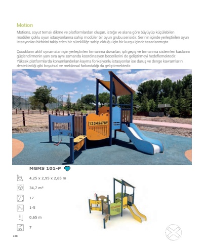 148Motions, soyut temal%u0131 dikme ve platformlardan olu%u015fan, iste%u011fe ve alana g%u00f6re b%u00fcy%u00fcy%u00fcp k%u00fc%u00e7%u00fclebilen mod%u00fcler %u00e7oklu oyun istasyonlar%u0131na sahip mod%u00fcler bir oyun grubu serisidir. Serinin i%u00e7inde yerle%u015ftirilen oyun istasyonlar%u0131 birbirini takip eden bir s%u00fcreklili%u011fe sahip oldu%u011fu i%u00e7in bir kurgu i%u00e7inde tasarlanm%u0131%u015ft%u0131r. %u00c7ocuklar%u0131n aktif oynamalar%u0131 i%u00e7in yerle%u015ftirilen t%u0131rmanma duvarlar%u0131, ipli ge%u00e7i%u015f ve t%u0131rmanma sistemleri kaslar%u0131n%u0131 g%u00fc%u00e7lendirmenin yan%u0131 s%u0131ra ayn%u0131 zamanda koordinasyon becerilerini de geli%u015ftirmeyi hedeflemektedir. Y%u00fcksek platformlarda konumland%u0131r%u0131lan kayma fonksiyonlu istasyonlar ise duru%u015f ve denge kavramlar%u0131n%u0131 destekledi%u011fi gibi boyutsal ve mek%u00e2nsal fark%u0131ndal%u0131%u011f%u0131 da geli%u015ftirmektedir.Motion4,25 x 2,95 x 2,65 m34,7 m%u00b2171-50,65 m7MGMS 101-P