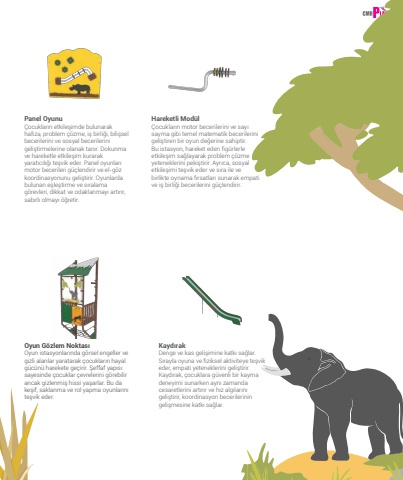 159Panel Oyunu%u00c7ocuklar%u0131n etkile%u015fimde bulunarak haf%u0131za, problem %u00e7%u00f6zme, i%u015f birli%u011fi, bili%u015fsel becerilerini ve sosyal becerilerini geli%u015ftirmelerine olanak tan%u0131r. Dokunma ve hareketle etkile%u015fim kurarak yarat%u0131c%u0131l%u0131%u011f%u0131 te%u015fvik eder. Panel oyunlar%u0131 motor becerileri g%u00fc%u00e7lendirir ve el-g%u00f6z koordinasyonunu geli%u015ftirir. Oyunlarda bulunan e%u015fle%u015ftirme ve s%u0131ralama g%u00f6revleri, dikkat ve odaklanmay%u0131 art%u0131r%u0131r, sab%u0131rl%u0131 olmay%u0131 %u00f6%u011fretir. Hareketli Mod%u00fcl%u00c7ocuklar%u0131n motor becerilerini ve say%u0131 sayma gibi temel matematik becerilerini geli%u015ftiren bir oyun de%u011ferine sahiptir. Bu istasyon, hareket eden fig%u00fcrlerle etkile%u015fim sa%u011flayarak problem %u00e7%u00f6zme yeteneklerini peki%u015ftirir. Ayr%u0131ca, sosyal etkile%u015fimi te%u015fvik eder ve s%u0131ra ile ve birlikte oynama f%u0131rsatlar%u0131 sunarak empati ve i%u015f birli%u011fi becerilerini g%u00fc%u00e7lendirir.Oyun G%u00f6zlem Noktas%u0131Oyun istasyonlar%u0131nda g%u00f6rsel engeller ve gizli alanlar yaratarak %u00e7ocuklar%u0131n hayal g%u00fcc%u00fcn%u00fc harekete ge%u00e7irir. %u015eeffaf yap%u0131s%u0131 sayesinde %u00e7ocuklar %u00e7evrelerini g%u00f6rebilir ancak gizlenmi%u015f hissi ya%u015farlar. Bu da ke%u015fif, saklanma ve rol yapma oyunlar%u0131n%u0131 te%u015fvik eder.Kayd%u0131rakDenge ve kas geli%u015fimine katk%u0131 sa%u011flar. S%u0131rayla oyuna ve fiziksel aktiviteye te%u015fvik eder, empati yeteneklerini geli%u015ftirir. Kayd%u0131rak, %u00e7ocuklara g%u00fcvenli bir kayma deneyimi sunarken ayn%u0131 zamanda cesaretlerini art%u0131r%u0131r ve h%u0131z alg%u0131lar%u0131n%u0131 geli%u015ftirir, koordinasyon becerilerinin geli%u015fmesine katk%u0131 sa%u011flar.