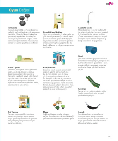 167Oyun De%u011feriT%u0131rmanmaFiziksel dayan%u0131kl%u0131l%u0131%u011f%u0131 ve motor becerileri geli%u015ftirir, sa%u011f-sol beyin koordinasyonunu destekler. G%u00fcvenli y%u00fckseklikle ke%u015fif ve yarat%u0131c%u0131l%u0131%u011f%u0131 te%u015fvik eder. Sosyalle%u015fme ve s%u0131rayla oyuna kat%u0131l%u0131m sa%u011flar. Zorluk derecesine g%u00f6re ilerleme imkan%u0131 sunar, denge ve hareket %u00e7e%u015fitlili%u011fini destekler. T%u00fcnel%u00c7ocuklar, t%u00fcnelden ge%u00e7erek fiziksel ve motor becerilerini geli%u015ftirir, denge ve y%u00f6n bulma yeteneklerini g%u00fc%u00e7lendirir. T%u00fcnel, sosyal etkile%u015fim ve s%u0131rayla oynamay%u0131 te%u015fvik eder, hayal g%u00fcc%u00fcn%u00fc harekete ge%u00e7irir.Hareketli Mod%u00fclMotor becerileri ve temel matematik becerilerini geli%u015ftiren bu oyun, hareketli fig%u00fcrlerle etkile%u015fim yoluyla problem %u00e7%u00f6zme yeteneklerini peki%u015ftirir. Sosyal etkile%u015fimi te%u015fvik ederek empati ve i%u015f birli%u011fi becerilerini de g%u00fc%u00e7lendirir.Kayd%u0131rakDenge ve kas geli%u015fimine katk%u0131 sa%u011flar. S%u0131rayla oyuna te%u015fvik eder, empati yeteneklerini geli%u015ftirir.Hamak%u00c7ocuklara dinlenme ve sallanma deneyimi sunar, denge ve motor becerilerini geli%u015ftirir. Sosyal oyunlar ve hayal g%u00fcc%u00fc temelli rollerle fiziksel ve zihinsel rahatlama sa%u011flar. Rol YapmaTemaya uygun %u015fekilde tasarlanan mod%u00fcl rol yapmaya dayal%u0131 oyunla hayal g%u00fcc%u00fc ve yarat%u0131c%u0131l%u0131klar%u0131n%u0131 geli%u015ftirir. Sosyalle%u015fmeye te%u015fvik eder, s%u0131rayla oynamay%u0131 %u00f6%u011fretir. Kau%u00e7uk Perde%u00c7ocuklar, esnek kau%u00e7uk perdelerden ge%u00e7erek gizemli alanlar ke%u015ffeder, bu da hem fiziksel hem de hayal g%u00fcc%u00fcne dayal%u0131 oyunlar%u0131 te%u015fvik eder. Bu deneyim, dokunsal alg%u0131 ve motor becerileri geli%u015ftirirken, denge ve v%u00fccut kontrol%u00fcn%u00fc g%u00fc%u00e7lendirir. Farkl%u0131 dokularla temas, duyusal geli%u015fimi destekler. Yap%u0131, %u00e7ocuklara g%u00fcvenli bir ortam sunarken cesaret ve %u00f6zg%u00fcvenlerini art%u0131r%u0131r.Oyun G%u00f6zlem Noktas%u0131Oyun istasyonlar%u0131nda g%u00f6rsel engeller ve gizli alanlar yaratarak %u00e7ocuklar%u0131n hayal g%u00fcc%u00fcn%u00fc harekete ge%u00e7irir. %u015eeffaf yap%u0131s%u0131 sayesinde %u00e7ocuklar %u00e7evrelerini g%u00f6rebilir ancak gizlenmi%u015f hissi ya%u015farlar. Bu da ke%u015fif, saklanma ve rol yapma oyunlar%u0131n%u0131 te%u015fvik eder. Panel Oyunu%u00c7ocuklar, etkile%u015fimle haf%u0131za, problem %u00e7%u00f6zme, i%u015f birli%u011fi, bili%u015fsel ve sosyal becerilerini geli%u015ftirir. Dokunma ve hareketle yarat%u0131c%u0131l%u0131k te%u015fvik edilir. Panel oyunlar%u0131 motor becerileri g%u00fc%u00e7lendirir, el-g%u00f6z koordinasyonunu geli%u015ftirir. E%u015fle%u015ftirme ve s%u0131ralama g%u00f6revleri dikkat, odaklanma ve sabr%u0131 art%u0131r%u0131r.Masa%u00c7oklu ve bireysel oyunlar i%u00e7in alan sa%u011flar. Sosyalle%u015fme noktas%u0131 olabilece%u011fi gibi dinlenme istasyonu g%u00f6revi de g%u00f6r%u00fcr.