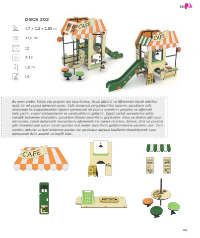 1694,7 x 2,2 x 2,85 m32,8 m%u00b2123-121,0 m14DGCS 303Bu oyun grubu, k%u00fc%u00e7%u00fck ya%u015f gruplar%u0131 i%u00e7in tasarlanm%u0131%u015f, hayal g%u00fcc%u00fcn%u00fc ve %u00f6%u011frenmeyi te%u015fvik ederken e%u015fsiz bir rol yapma deneyimi sunar. Cafe temas%u0131yla zenginle%u015ftirilen tasar%u0131m, %u00e7ocuklar%u0131n cafe ortam%u0131nda kar%u015f%u0131la%u015fabilecekleri %u00f6geleri i%u00e7ermesiyle rol yapma oyunlar%u0131n%u0131 ger%u00e7ek%u00e7i ve e%u011flenceli hale getirir, sosyal etkile%u015fimlerini ve yarat%u0131c%u0131l%u0131klar%u0131n%u0131 geli%u015ftirir. %u00c7e%u015fitli zorluk seviyelerine sahip tematik t%u0131rmanma elemanlar%u0131, %u00e7ocuklar%u0131n fiziksel becerilerini g%u00fc%u00e7lendirir. Kasa ve abak%u00fcs gibi oyun elemanlar%u0131, temel matematik kavramlar%u0131n%u0131 %u00f6%u011frenmelerine olanak tan%u0131rken, d%u00f6nme, itme ve %u00e7evirme gibi mekanizmalar i%u00e7eren panel oyunlar%u0131 ince motor becerilerini geli%u015ftirmelerine yard%u0131mc%u0131 olur. Canl%u0131 renkler, dokular ve %u00f6zel dinlenme alanlar%u0131 ise %u00e7ocuklar%u0131n duyusal ke%u015fiflerini destekleyerek oyun deneyimini daha anlaml%u0131 ve keyifli k%u0131lar.