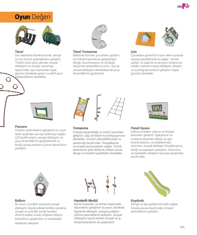 175T%u00fcnelDar alanlarda hareket etmek, denge ve y%u00f6n bulma yeteneklerini geli%u015ftirir. T%u00fcnelin i%u00e7ine girip %u00e7%u0131kmak, sosyal etkile%u015fimi ve s%u0131rayla oynamay%u0131 te%u015fvik eder; ayn%u0131 zamanda hayal g%u00fcc%u00fcn%u00fc harekete ge%u00e7irir ve aktif oyun al%u0131%u015fkanl%u0131klar%u0131n%u0131 destekler.Kayd%u0131rakDenge ve kas geli%u015fimine katk%u0131 sa%u011flar. S%u0131rayla oyuna te%u015fvik eder, empati yeteneklerini geli%u015ftirir.BalkonBu oyun, %u00e7ocuklar aras%u0131nda sosyal etkile%u015fimi te%u015fvik ederek birlikte oynama, s%u0131rayla ve i%u015f birli%u011fi i%u00e7inde hareket etme f%u0131rsatlar%u0131 sunar; b%u00f6ylece ileti%u015fim becerilerini g%u00fc%u00e7lendirir ve arkada%u015fl%u0131k ili%u015fkilerini peki%u015ftirir.Oyun De%u011feriT%u0131rmanmaFiziksel dayan%u0131kl%u0131l%u0131%u011f%u0131 ve motor becerileri geli%u015ftirir, sa%u011f-sol beyin koordinasyonunu destekler. G%u00fcvenli y%u00fckseklikle ke%u015fif ve yarat%u0131c%u0131l%u0131%u011f%u0131 te%u015fvik eder. Sosyalle%u015fme ve s%u0131rayla oyuna kat%u0131l%u0131m sa%u011flar. Zorluk derecesine g%u00f6re ilerleme imkan%u0131 sunar, denge ve hareket %u00e7e%u015fitlili%u011fini destekler. PencereG%u00f6zlem yeteneklerini geli%u015ftiren bu oyun, farkl%u0131 a%u00e7%u0131lardan %u00e7evreyi anlamay%u0131 sa%u011flar. %u00c7ift tarafl%u0131 eri%u015fim, sosyal etkile%u015fimi ve grup dinamiklerini g%u00fc%u00e7lendirerek i%u015f birli%u011fi i%u00e7inde problem %u00e7%u00f6zme becerilerini peki%u015ftirir.%u00c7at%u0131%u00c7ocuklara g%u00fcvenli bir oyun alan%u0131 sunarak rahat%u00e7a ke%u015ffetmelerini sa%u011flar. Temal%u0131 %u00e7at%u0131lar, rol yapma ve senaryo olu%u015fturma imk%u00e2n%u0131 vererek sosyal etkile%u015fim, ileti%u015fim ve i%u015f birli%u011fi becerilerini geli%u015ftirir, hayal g%u00fcc%u00fcn%u00fc destekler.T%u00fcnel T%u0131rmanmaB%u00fck%u00fcml%u00fc borular, %u00e7ocuklar%u0131n g%u00f6zlem ve fiziksel becerilerini geli%u015ftirirken, denge, koordinasyon ve stratejik d%u00fc%u015f%u00fcnme yeteneklerini art%u0131r%u0131r. Ayr%u0131ca, sosyal etkile%u015fimi destekleyerek grup dinamiklerini g%u00fc%u00e7lendirir.Panel Oyunu Haf%u0131za, problem %u00e7%u00f6zme ve bili%u015fsel becerileri geli%u015ftirir. E%u015fle%u015ftirme ve s%u0131ralama g%u00f6revleri dikkat, el-g%u00f6z koordinasyonu ve odaklanmay%u0131 art%u0131r%u0131rken, sosyal etkile%u015fim f%u0131rsatlar%u0131yla i%u015f birli%u011fi ve payla%u015f%u0131m%u0131 peki%u015ftirir. Dokunma ve hareketle etkile%u015fim kurarak yarat%u0131c%u0131l%u0131%u011f%u0131 te%u015fvik eder.Hareketli Mod%u00fclMotor becerileri ve temel matematik becerilerini geli%u015ftiren bu oyun, hareketli fig%u00fcrlerle etkile%u015fim yoluyla problem %u00e7%u00f6zme yeteneklerini peki%u015ftirir. Sosyal etkile%u015fimi te%u015fvik ederek empati ve i%u015f birli%u011fi becerilerini de g%u00fc%u00e7lendirir.