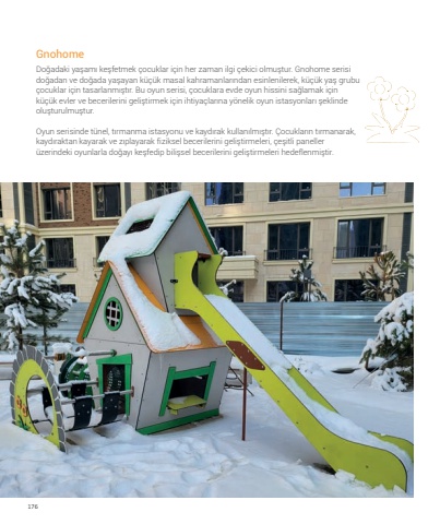 176Do%u011fadaki ya%u015fam%u0131 ke%u015ffetmek %u00e7ocuklar i%u00e7in her zaman ilgi %u00e7ekici olmu%u015ftur. Gnohome serisi do%u011fadan ve do%u011fada ya%u015fayan k%u00fc%u00e7%u00fck masal kahramanlar%u0131ndan esinlenilerek, k%u00fc%u00e7%u00fck ya%u015f grubu %u00e7ocuklar i%u00e7in tasarlanm%u0131%u015ft%u0131r. Bu oyun serisi, %u00e7ocuklara evde oyun hissini sa%u011flamak i%u00e7in k%u00fc%u00e7%u00fck evler ve becerilerini geli%u015ftirmek i%u00e7in ihtiya%u00e7lar%u0131na y%u00f6nelik oyun istasyonlar%u0131 %u015feklinde olu%u015fturulmu%u015ftur. Oyun serisinde t%u00fcnel, t%u0131rmanma istasyonu ve kayd%u0131rak kullan%u0131lm%u0131%u015ft%u0131r. %u00c7ocuklar%u0131n t%u0131rmanarak, kayd%u0131raktan kayarak ve z%u0131playarak fiziksel becerilerini geli%u015ftirmeleri, %u00e7e%u015fitli paneller %u00fczerindeki oyunlarla do%u011fay%u0131 ke%u015ffedip bili%u015fsel becerilerini geli%u015ftirmeleri hedeflenmi%u015ftir.Gnohome