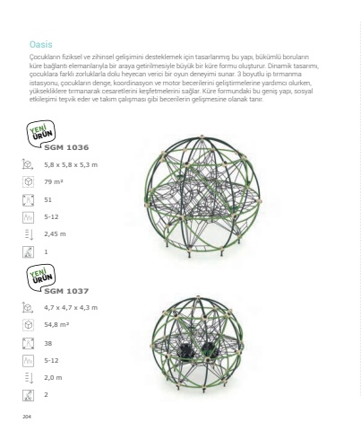 2045,8 x 5,8 x 5,3 m79 m%u00b2515-122,45 m1SGM 10364,7 x 4,7 x 4,3 m54,8 m%u00b2385-122,0 m2SGM 1037%u00c7ocuklar%u0131n fiziksel ve zihinsel geli%u015fimini desteklemek i%u00e7in tasarlanm%u0131%u015f bu yap%u0131, b%u00fck%u00fcml%u00fc borular%u0131n k%u00fcre ba%u011flant%u0131 elemanlar%u0131yla bir araya getirilmesiyle b%u00fcy%u00fck bir k%u00fcre formu olu%u015fturur. Dinamik tasar%u0131m%u0131, %u00e7ocuklara farkl%u0131 zorluklarla dolu heyecan verici bir oyun deneyimi sunar. 3 boyutlu ip t%u0131rmanma istasyonu, %u00e7ocuklar%u0131n denge, koordinasyon ve motor becerilerini geli%u015ftirmelerine yard%u0131mc%u0131 olurken, y%u00fcksekliklere t%u0131rmanarak cesaretlerini ke%u015ffetmelerini sa%u011flar. K%u00fcre formundaki bu geni%u015f yap%u0131, sosyal etkile%u015fimi te%u015fvik eder ve tak%u0131m %u00e7al%u0131%u015fmas%u0131 gibi becerilerin geli%u015fmesine olanak tan%u0131r.Oasis%u00dcR%u00dcN%u00dcR%u00dcN
