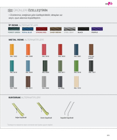 205%u00dcR%u00dcNLER%u0130 %u00d6ZELLE%u015eT%u0130R%u0130N%u0130P RENK ALTERNAT%u0130FLER%u0130KAYDIRAK ALTERNAT%u0130FLER%u0130* %u00dcr%u00fcnlerimiz, iste%u011finize g%u00f6re %u00f6zelle%u015ftirilebilir; detaylar%u0131 siz se%u00e7in, oyun alan%u0131n%u0131z%u0131 ki%u015fiselle%u015ftirin.FOREST GREEN ROYAL BLUE STRONG RED SANDY BROWN STEEL GRAY BLACK PURPLERAL 1003 RAL 2008 RAL 3018 RAL 3020 RAL 5001 core ten xy355fRAL 5018RAL 7040RAL 5024RAL 8011RAL 6009RAL 9006RAL 6011sw 306gRAL 6018 RAL 7021METAL RENK ALTERNAT%u0130FLER%u0130RAL 1015hdpe kayd%u0131rak krom kayd%u0131rak hayalet kayd%u0131rak*%u00d6zelle%u015ftirme taleplerine ili%u015fkin %u00fcr%u00fcnlerde liste fiyatlar%u0131 ge%u00e7erli de%u011fildir.