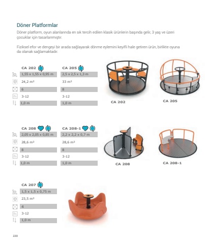 220D%u00f6ner platform, oyun alanlar%u0131nda en s%u0131k tercih edilen klasik %u00fcr%u00fcnlerin ba%u015f%u0131nda gelir, 3 ya%u015f ve %u00fczeri %u00e7ocuklar i%u00e7in tasarlanm%u0131%u015ft%u0131r. Fiziksel efor ve dengeyi bir arada sa%u011flayarak d%u00f6nme eylemini keyifli hale getiren %u00fcr%u00fcn, birlikte oyuna da olanak sa%u011flamaktad%u0131r.D%u00f6ner Platformlar1,55 x 1,55 x 0,95 m2,05 x 2,05 x 0,85 m2,5 x 2,5 x 1,3 m2,2 x 2,2 x 0,7 m24,2 m%u00b228,6 m%u00b233 m%u00b228,6 m%u00b268883-123-123-123-12CA 202CA 208CA 202CA 205CA 208-1CA 205CA 208 CA 208-11,0 m 1,0 m1,0 m 1,0 m1,5 x 1,5 x 0,75 m23,5 m%u00b243-12CA 2071,0 m