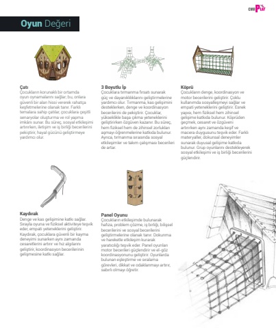 225Oyun De%u011feri%u00c7at%u0131%u00c7ocuklar%u0131n korunakl%u0131 bir ortamda oyun oynamalar%u0131n%u0131 sa%u011flar; bu, onlara g%u00fcvenli bir alan hissi vererek rahat%u00e7a ke%u015ffetmelerine olanak tan%u0131r. Farkl%u0131 temalara sahip %u00e7at%u0131lar, %u00e7ocuklara %u00e7e%u015fitli senaryolar olu%u015fturma ve rol yapma imk%u00e2n%u0131 sunar. Bu s%u00fcre%u00e7, sosyal etkile%u015fimi art%u0131r%u0131rken, ileti%u015fim ve i%u015f birli%u011fi becerilerini peki%u015ftirir, hayal g%u00fcc%u00fcn%u00fc geli%u015ftirmeye yard%u0131mc%u0131 olur. 3 Boyutlu %u0130p%u00c7ocuklara t%u0131rmanma f%u0131rsat%u0131 sunarak g%u00fc%u00e7 ve dayan%u0131kl%u0131l%u0131klar%u0131n%u0131 geli%u015ftirmelerine yard%u0131mc%u0131 olur. T%u0131rmanma, kas geli%u015fimini desteklerken, denge ve koordinasyon becerilerini de peki%u015ftirir. %u00c7ocuklar, y%u00fckseklikle ba%u015fa %u00e7%u0131kma yeteneklerini geli%u015ftirirken %u00f6zg%u00fcven kazan%u0131r. Bu s%u00fcre%u00e7, hem fiziksel hem de zihinsel zorluklar%u0131 a%u015fmay%u0131 %u00f6%u011frenmelerine katk%u0131da bulunur. Ayr%u0131ca, t%u0131rmanma s%u0131ras%u0131nda sosyal etkile%u015fimler ve tak%u0131m %u00e7al%u0131%u015fmas%u0131 becerileri de artar.Kayd%u0131rakDenge ve kas geli%u015fimine katk%u0131 sa%u011flar. S%u0131rayla oyuna ve fiziksel aktiviteye te%u015fvik eder, empati yeteneklerini geli%u015ftirir. Kayd%u0131rak, %u00e7ocuklara g%u00fcvenli bir kayma deneyimi sunarken ayn%u0131 zamanda cesaretlerini art%u0131r%u0131r ve h%u0131z alg%u0131lar%u0131n%u0131 geli%u015ftirir, koordinasyon becerilerinin geli%u015fmesine katk%u0131 sa%u011flar.Panel Oyunu%u00c7ocuklar%u0131n etkile%u015fimde bulunarak haf%u0131za, problem %u00e7%u00f6zme, i%u015f birli%u011fi, bili%u015fsel becerilerini ve sosyal becerilerini geli%u015ftirmelerine olanak tan%u0131r. Dokunma ve hareketle etkile%u015fim kurarak yarat%u0131c%u0131l%u0131%u011f%u0131 te%u015fvik eder. Panel oyunlar%u0131 motor becerileri g%u00fc%u00e7lendirir ve el-g%u00f6z koordinasyonunu geli%u015ftirir. Oyunlarda bulunan e%u015fle%u015ftirme ve s%u0131ralama g%u00f6revleri, dikkat ve odaklanmay%u0131 art%u0131r%u0131r, sab%u0131rl%u0131 olmay%u0131 %u00f6%u011fretir. K%u00f6pr%u00fc%u00c7ocuklar%u0131n denge, koordinasyon ve motor becerilerini geli%u015ftirir. %u00c7oklu kullan%u0131mda sosyalle%u015fmeyi sa%u011flar ve empati yeteneklerini geli%u015ftirir. Esnek yap%u0131s%u0131, hem fiziksel hem zihinsel geli%u015fime katk%u0131da bulunur. K%u00f6pr%u00fcden ge%u00e7mek, cesaret ve %u00f6zg%u00fcveni art%u0131r%u0131rken ayn%u0131 zamanda ke%u015fif ve macera duygusunu te%u015fvik eder. Farkl%u0131 materyaller, dokunsal deneyimler sunarak duyusal geli%u015fime katk%u0131da bulunur. Grup oyunlar%u0131n%u0131 destekleyerek sosyal etkile%u015fimi ve i%u015f birli%u011fi becerilerini g%u00fc%u00e7lendirir.