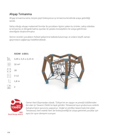 238Ah%u015fap t%u0131rmanma serisi, bir%u00e7ok %u00e7e%u015fit fonksiyonun ip t%u0131rmanma temelinde araya getirildi%u011fi seridir. Sahip oldu%u011fu ah%u015fap malzemeli formlar ile %u00e7ocuklar%u0131n ilgisini %u00e7eken bu %u00fcr%u00fcnler; sahip olduklar%u0131 ip t%u0131rmanma ve dengede kalma oyunlar%u0131 ile yarat%u0131c%u0131 konseptlerin bir araya getirilmesi arac%u0131l%u0131%u011f%u0131yla olu%u015fturulmu%u015ftur. Serinin %u00fcr%u00fcnleri %u00e7ocuklar%u0131n fiziksel geli%u015fimine katk%u0131da bulunmay%u0131 ve onlar%u0131n keyifli zaman ge%u00e7irmesini sa%u011flamay%u0131 hedeflemektedir.Ah%u015fap T%u0131rmanma3,45 x 3,5 x 2,15 m32 m%u00b2183-121,8 m2SGW 1001Cemer Kent Ekipmanlar%u0131 olarak, T%u00fcrkiye%u2019nin en sayg%u0131n ve prestijli %u00f6d%u00fcllerinden biri olan %u0130yi Tasar%u0131m %u00d6d%u00fcl%u00fc%u2019ne lay%u0131k g%u00f6r%u00fclen Tetrawood oyun grubumuzu sizlerle bulu%u015fturman%u0131n gururunu ya%u015f%u0131yoruz. Do%u011fal ve yenilik%u00e7i tasar%u0131m%u0131yla %u00f6ne %u00e7%u0131kan Tetrawood, hem estetik hem de fonksiyonelli%u011fi bir araya getirerek %u00e7ocuklar i%u00e7in e%u015fsiz bir oyun deneyimi sunuyor.