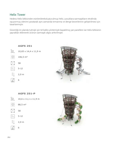 252Hedera Helix bitkisinden esinlenilerekolu%u015fturulmu%u015f Helix, %u00e7ocuklara sarma%u015f%u0131klar%u0131n etraf%u0131nda o%u015fuyormu%u015f izlenimi yaratarak ayn%u0131 zamanda t%u0131rmanma ve denge becerilerinin geli%u015ftirilmesi i%u00e7in tasarlanm%u0131%u015ft%u0131r. G%u00fcvenli%u011fi %u00f6n planda tutmak i%u00e7in tel kafes y%u00f6ntemiyle kapat%u0131lm%u0131%u015f yan panellere ise Helix bitkisinin yapraklar%u0131 eklenerek %u00fcr%u00fcn%u00fcn sarma%u015f%u0131k alg%u0131s%u0131 artt%u0131r%u0131lm%u0131%u015ft%u0131r.Helix Tower10,65 x 14,4 x 11,9 m10,6 x 11,1 x 11,9 m106,5 m%u00b288,5 m%u00b258585-125-122,0 m62,0 m6AGFS 251AGFS 251-P