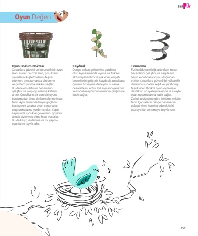 257Oyun De%u011feriKayd%u0131rakDenge ve kas geli%u015fimine yard%u0131mc%u0131 olur. Ayn%u0131 zamanda oyuna ve fiziksel aktiviteye kat%u0131l%u0131m%u0131 te%u015fvik eder, empati becerilerini geli%u015ftirir. Kayd%u0131rak, %u00e7ocuklara g%u00fcvenli bir kayma deneyimi sunarak cesaretlerini art%u0131r%u0131r, h%u0131z alg%u0131lar%u0131n%u0131 geli%u015ftirir ve koordinasyon becerilerinin geli%u015fimine katk%u0131 sa%u011flar.Oyun G%u00f6zlem Noktas%u0131%u00c7ocuklara g%u00fcvenli ve korunakl%u0131 bir oyun alan%u0131 sunar. Bu %u00f6zel alan, %u00e7ocuklar%u0131n %u00e7evrelerini ke%u015ffetmelerini te%u015fvik ederken, ayn%u0131 zamanda dinlenme ve g%u00f6zlem yapma imk%u00e2n%u0131 sa%u011flar. Bu deneyim, ileti%u015fim becerilerini geli%u015ftirir ve grup oyunlar%u0131na kat%u0131l%u0131m%u0131 art%u0131r%u0131r. %u00c7ocuklar%u0131n bir sonraki oyuna ba%u015flamadan %u00f6nce dinlenmelerine f%u0131rsat tan%u0131r. Ayn%u0131 zamanda hayal g%u00fc%u00e7lerini besleyerek yarat%u0131c%u0131 oyun senaryolar%u0131 olu%u015fturmalar%u0131na yard%u0131mc%u0131 olur. Yap%u0131s%u0131 sayesinde %u00e7ocuklar %u00e7evrelerini g%u00f6rebilir ancak gizlenmi%u015f olma hissi ya%u015farlar. Bu da ke%u015fif, saklanma ve rol yapma oyunlar%u0131n%u0131 te%u015fvik eder.T%u0131rmanmaFiziksel dayan%u0131kl%u0131l%u0131%u011f%u0131 art%u0131r%u0131rken motor becerilerini geli%u015ftirir ve sa%u011f ile sol beyin koordinasyonunu do%u011frudan etkiler. %u00c7ocuklara g%u00fcvenli bir y%u00fckseklik deneyimi sunarak ke%u015fif ve yarat%u0131c%u0131l%u0131%u011f%u0131 te%u015fvik eder. Birlikte oyun oynamay%u0131 destekler; sosyalle%u015fmelerine ve s%u0131rayla oyun oynamalar%u0131na katk%u0131 sa%u011flar. Zorluk seviyesine g%u00f6re ilerleme imk%u00e2n%u0131 tan%u0131r. %u00c7ocuklar%u0131n denge becerilerini peki%u015ftirirken, hareket ederek farkl%u0131 pozisyonlar denemeye te%u015fvik eder.