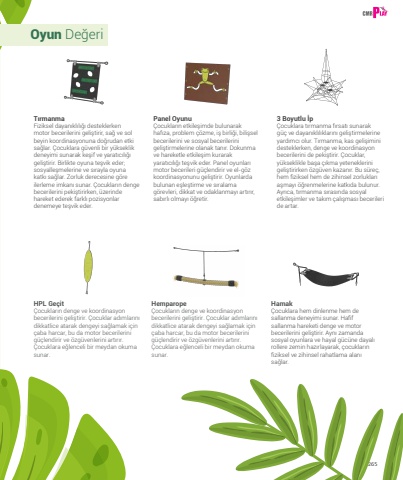 265T%u0131rmanmaFiziksel dayan%u0131kl%u0131l%u0131%u011f%u0131 desteklerken motor becerilerini geli%u015ftirir, sa%u011f ve sol beyin koordinasyonuna do%u011frudan etki sa%u011flar. %u00c7ocuklara g%u00fcvenli bir y%u00fckseklik deneyimi sunarak ke%u015fif ve yarat%u0131c%u0131l%u0131%u011f%u0131 geli%u015ftirir. Birlikte oyuna te%u015fvik eder; sosyalle%u015fmelerine ve s%u0131rayla oyuna katk%u0131 sa%u011flar. Zorluk derecesine g%u00f6re ilerleme imkan%u0131 sunar. %u00c7ocuklar%u0131n denge becerilerini peki%u015ftirirken, %u00fczerinde hareket ederek farkl%u0131 pozisyonlar denemeye te%u015fvik eder. Panel Oyunu%u00c7ocuklar%u0131n etkile%u015fimde bulunarak haf%u0131za, problem %u00e7%u00f6zme, i%u015f birli%u011fi, bili%u015fsel becerilerini ve sosyal becerilerini geli%u015ftirmelerine olanak tan%u0131r. Dokunma ve hareketle etkile%u015fim kurarak yarat%u0131c%u0131l%u0131%u011f%u0131 te%u015fvik eder. Panel oyunlar%u0131 motor becerileri g%u00fc%u00e7lendirir ve el-g%u00f6z koordinasyonunu geli%u015ftirir. Oyunlarda bulunan e%u015fle%u015ftirme ve s%u0131ralama g%u00f6revleri, dikkat ve odaklanmay%u0131 art%u0131r%u0131r, sab%u0131rl%u0131 olmay%u0131 %u00f6%u011fretir. 3 Boyutlu %u0130p%u00c7ocuklara t%u0131rmanma f%u0131rsat%u0131 sunarak g%u00fc%u00e7 ve dayan%u0131kl%u0131l%u0131klar%u0131n%u0131 geli%u015ftirmelerine yard%u0131mc%u0131 olur. T%u0131rmanma, kas geli%u015fimini desteklerken, denge ve koordinasyon becerilerini de peki%u015ftirir. %u00c7ocuklar, y%u00fckseklikle ba%u015fa %u00e7%u0131kma yeteneklerini geli%u015ftirirken %u00f6zg%u00fcven kazan%u0131r. Bu s%u00fcre%u00e7, hem fiziksel hem de zihinsel zorluklar%u0131 a%u015fmay%u0131 %u00f6%u011frenmelerine katk%u0131da bulunur. Ayr%u0131ca, t%u0131rmanma s%u0131ras%u0131nda sosyal etkile%u015fimler ve tak%u0131m %u00e7al%u0131%u015fmas%u0131 becerileri de artar.Oyun De%u011feriHemparope%u00c7ocuklar%u0131n denge ve koordinasyon becerilerini geli%u015ftirir. %u00c7ocuklar ad%u0131mlar%u0131n%u0131 dikkatlice atarak dengeyi sa%u011flamak i%u00e7in %u00e7aba harcar, bu da motor becerilerini g%u00fc%u00e7lendirir ve %u00f6zg%u00fcvenlerini art%u0131r%u0131r. %u00c7ocuklara e%u011flenceli bir meydan okuma sunar.HPL Ge%u00e7it%u00c7ocuklar%u0131n denge ve koordinasyon becerilerini geli%u015ftirir. %u00c7ocuklar ad%u0131mlar%u0131n%u0131 dikkatlice atarak dengeyi sa%u011flamak i%u00e7in %u00e7aba harcar, bu da motor becerilerini g%u00fc%u00e7lendirir ve %u00f6zg%u00fcvenlerini art%u0131r%u0131r. %u00c7ocuklara e%u011flenceli bir meydan okuma sunar.Hamak%u00c7ocuklara hem dinlenme hem de sallanma deneyimi sunar. Hafif sallanma hareketi denge ve motor becerilerini geli%u015ftirir. Ayn%u0131 zamanda sosyal oyunlara ve hayal g%u00fcc%u00fcne dayal%u0131 rollere zemin haz%u0131rlayarak, %u00e7ocuklar%u0131n fiziksel ve zihinsel rahatlama alan%u0131 sa%u011flar.
