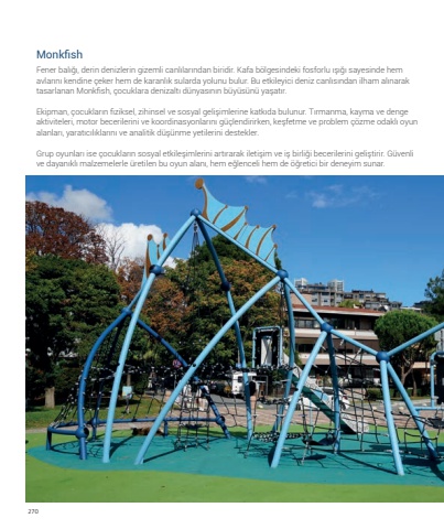 270MonkfishFener bal%u0131%u011f%u0131, derin denizlerin gizemli canl%u0131lar%u0131ndan biridir. Kafa b%u00f6lgesindeki fosforlu %u0131%u015f%u0131%u011f%u0131 sayesinde hem avlar%u0131n%u0131 kendine %u00e7eker hem de karanl%u0131k sularda yolunu bulur. Bu etkileyici deniz canl%u0131s%u0131ndan ilham al%u0131narak tasarlanan Monkfish, %u00e7ocuklara denizalt%u0131 d%u00fcnyas%u0131n%u0131n b%u00fcy%u00fcs%u00fcn%u00fc ya%u015fat%u0131r.Ekipman, %u00e7ocuklar%u0131n fiziksel, zihinsel ve sosyal geli%u015fimlerine katk%u0131da bulunur. T%u0131rmanma, kayma ve denge aktiviteleri, motor becerilerini ve koordinasyonlar%u0131n%u0131 g%u00fc%u00e7lendirirken, ke%u015ffetme ve problem %u00e7%u00f6zme odakl%u0131 oyun alanlar%u0131, yarat%u0131c%u0131l%u0131klar%u0131n%u0131 ve analitik d%u00fc%u015f%u00fcnme yetilerini destekler. Grup oyunlar%u0131 ise %u00e7ocuklar%u0131n sosyal etkile%u015fimlerini art%u0131rarak ileti%u015fim ve i%u015f birli%u011fi becerilerini geli%u015ftirir. G%u00fcvenli ve dayan%u0131kl%u0131 malzemelerle %u00fcretilen bu oyun alan%u0131, hem e%u011flenceli hem de %u00f6%u011fretici bir deneyim sunar.