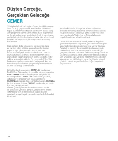 28Kendi sekt%u00f6r%u00fcnde, T%u00fcrkiye%u2019nin ad%u0131n%u0131 uluslararas%u0131 arenada duyurmay%u0131 ba%u015farm%u0131%u015f olman%u0131n verdi%u011fi gururla %u201cD%u00fc%u015ften Ger%u00e7e%u011fe%u201d slogan%u0131yla %u00e7%u0131kt%u0131%u011f%u0131 yolda yeni nesil oyun gruplar%u0131yla T%u00fcrkiye%u2019de ve D%u00fcnyada ba%u015far%u0131l%u0131 projelerle ad%u0131ndan s%u00f6z ettirmektedir. Cemer%u2019in bundan sonraki hedefi; sekt%u00f6rel de%u011fi%u015fimin %u00e7ok h%u0131zl%u0131 geli%u015fmesini sa%u011flamak, yeni nesil oyun gruplar%u0131 alan%u0131ndaki liderli%u011fini s%u00fcrd%u00fcrmek, fiyat yerine %u201cKalitede Rekabet ve Yenilik%u201d ilkesini sekt%u00f6r%u00fcne kazand%u0131rmak, beklentilerin %u00fczerinde yarat%u0131c%u0131 %u00fcr%u00fcnler sunmak i%u00e7in %u00e7al%u0131%u015fmak olacakt%u0131r. Sekt%u00f6rde farkl%u0131l%u0131klar yarat%u0131p ulusal ve uluslararas%u0131 arenada kal%u0131c%u0131 %u00fcst%u00fcnl%u00fckler sa%u011flamak ad%u0131na yeni ufuklara do%u011fru yol alma hedeflerimizde, sizlerden alaca%u011f%u0131m%u0131z her t%u00fcrl%u00fc ele%u015ftiri ya da %u00f6vg%u00fc bizler i%u00e7in yol g%u00f6sterici olacak ve yeni hedeflere do%u011fru ko%u015fmam%u0131z%u0131 sa%u011flayacakt%u0131r.1994 y%u0131l%u0131nda %u0130zmir%u2019de kurulan Cemer Kent Ekipmanlar%u0131 San. Tic. A.%u015e. %u00e7eyrek as%u0131rl%u0131k tecr%u00fcbesiyle 25.000 m%u00b2 kapal%u0131 30.000 m%u00b2 a%u00e7%u0131k toplam 55.000 m%u00b2 alana sahip 300 %u00e7al%u0131%u015fan%u0131yla hizmet vermektedir. Kent ekipmanlar%u0131 ve donat%u0131 malzemeleri sekt%u00f6r%u00fcnde %u00f6nc%u00fc firma olman%u0131n verdi%u011fi bilin%u00e7le, fikirden %u00fcretime kadar t%u00fcm s%u00fcreci kendi b%u00fcnyesinde olu%u015fturarak, bir d%u00fcnya markas%u0131 olmay%u0131 ba%u015farm%u0131%u015ft%u0131r. H%u0131zla geli%u015fen dijital teknolojiler beraberinde daha az hareket eden, gittik%u00e7e asosyalle%u015fen bir toplum yap%u0131s%u0131 ortaya %u00e7%u0131karmaktad%u0131r. Bunun yan%u0131 s%u0131ra n%u00fcfus artarken ye%u015fil alanlar azalmaktad%u0131r. T%u00fcm bu olumsuzluklar%u0131 g%u00f6z %u00f6n%u00fcne ald%u0131%u011f%u0131m%u0131z zaman nefes alan ald%u0131ran ya%u015fam alanlar%u0131n%u0131n %u00f6nemi %u00e7ok daha iyi bir %u015fekilde anla%u015f%u0131labilmektedir. Bu %u00e7er%u00e7evede 7%u2019den 70%u2019e herkesin sosyalle%u015fmesine katk%u0131 sa%u011flayacak, kas ve koordinasyon sisteminin geli%u015fimine yard%u0131mc%u0131 olacak %u00fcr%u00fcnler tasarlay%u0131p %u00fcretmektedir. Kaliteli bir kent ya%u015fam%u0131 i%u00e7in; CMRPLAY markas%u0131 ve Parkfit Kent Ekipmanlar%u0131 ile %u00e7ocuklar i%u00e7in oyun parklar%u0131, CMRXTREME markas%u0131 ile gen%u00e7ler ve yeti%u015fkinler i%u00e7in macera parklar%u0131, CMRACTIVE markas%u0131 ile %u00e7ocuklar, yeti%u015fkinler ve engelliler i%u00e7in fitness aletleri ve CMRURBAN markas%u0131 ile de kent ekipmanlar%u0131, CMRIDEAile %u00f6zel tasar%u0131m %u00fcr%u00fcnler, CMRHIC markas%u0131 ile yer zemin i%u00e7in kau%u00e7uk %u00fcretmektedir. Cemer; g%u00fcvenli%u011fi temel alarak tasarlanan %u00fcr%u00fcnler ile %u00e7ocuklar%u0131n yan%u0131 s%u0131ra gen%u00e7ler, yeti%u015fkinler ve engelli vatanda%u015flar i%u00e7in de e%u011flenceli ve sa%u011fl%u0131kl%u0131 alanlar yaratarak sosyal hayat%u0131 canland%u0131rmay%u0131 hedefle hareket etmektedir. D%u00fc%u015ften Ger%u00e7e%u011fe, Ger%u00e7ekten Gelece%u011fe CEMER