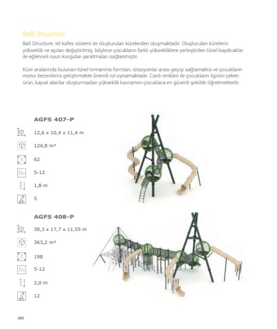 280Ball Structure, tel kafes sistemi ile olu%u015fturulan k%u00fcrelerden olu%u015fmaktad%u0131r. Olu%u015fturulan k%u00fcrelerin y%u00fckseklik ve a%u00e7%u0131lar%u0131 de%u011fi%u015ftirilmi%u015f, b%u00f6ylece %u00e7ocuklar%u0131n farkl%u0131 y%u00fcksekliklere yerle%u015ftirilen t%u00fcnel kayd%u0131raklar ile e%u011flenceli oyun kurgular%u0131 yaratmalar%u0131 sa%u011flanm%u0131%u015ft%u0131r. K%u00fcre aralar%u0131nda bulunan t%u00fcnel t%u0131rmanma formlar%u0131, istasyonlar aras%u0131 ge%u00e7i%u015fi sa%u011flamakta ve %u00e7ocuklar%u0131n motor becerilerini geli%u015ftirmekte %u00f6nemli rol oynamaktad%u0131r. Canl%u0131 renkleri ile %u00e7ocuklar%u0131n ilgisini %u00e7eken %u00fcr%u00fcn, kapal%u0131 alanlar olu%u015fturmadan y%u00fckseklik kavram%u0131n%u0131 %u00e7ocuklara en g%u00fcvenli %u015fekilde %u00f6%u011fretmektedir.Ball Structure12,6 x 10,4 x 11,4 m30,3 x 17,7 x 11,55 m124,8 m%u00b2363,2 m%u00b2621985-125-121,8 m52,0 m12AGFS 407-PAGFS 408-P