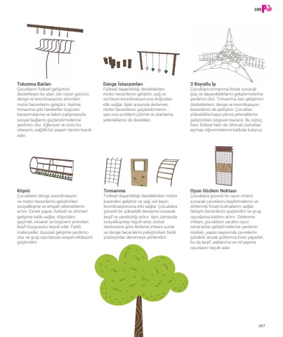 297K%u00f6pr%u00fc%u00c7ocuklar%u0131n denge, koordinasyon ve motor becerilerini geli%u015ftirirken sosyalle%u015fme ve empati yeteneklerini art%u0131r%u0131r. Esnek yap%u0131s%u0131, fiziksel ve zihinsel geli%u015fime katk%u0131 sa%u011flar. K%u00f6pr%u00fcden ge%u00e7mek, cesaret ve %u00f6zg%u00fcveni art%u0131r%u0131rken ke%u015fif duygusunu te%u015fvik eder. Farkl%u0131 materyaller, duyusal geli%u015fime yard%u0131mc%u0131 olur ve grup oyunlar%u0131yla sosyal etkile%u015fimi g%u00fc%u00e7lendirir.Oyun G%u00f6zlem Noktas%u0131%u00c7ocuklara g%u00fcvenli bir oyun ortam%u0131 sunarak %u00e7evrelerini ke%u015ffetmelerini ve dinlenme f%u0131rsat%u0131 bulmalar%u0131n%u0131 sa%u011flar. %u0130leti%u015fim becerilerini g%u00fc%u00e7lendirir ve grup oyunlar%u0131na kat%u0131l%u0131m%u0131 art%u0131r%u0131r. Dinlenme imkan%u0131, %u00e7ocuklar%u0131n yarat%u0131c%u0131 oyun senaryolar%u0131 geli%u015ftirmelerine yard%u0131mc%u0131 olurken, yap%u0131s%u0131 sayesinde %u00e7evrelerini g%u00f6rebilir ancak gizlenmi%u015f hissi ya%u015farlar; bu da ke%u015fif, saklanma ve rol yapma oyunlar%u0131n%u0131 te%u015fvik eder.3 Boyutlu %u0130p%u00c7ocuklara t%u0131rmanma f%u0131rsat%u0131 sunarak g%u00fc%u00e7 ve dayan%u0131kl%u0131l%u0131klar%u0131n%u0131 geli%u015ftirmelerine yard%u0131mc%u0131 olur. T%u0131rmanma, kas geli%u015fimini desteklerken, denge ve koordinasyon becerilerini de peki%u015ftirir. %u00c7ocuklar, y%u00fckseklikle ba%u015fa %u00e7%u0131kma yeteneklerini geli%u015ftirirken %u00f6zg%u00fcven kazan%u0131r. Bu s%u00fcre%u00e7, hem fiziksel hem de zihinsel zorluklar%u0131 a%u015fmay%u0131 %u00f6%u011frenmelerine katk%u0131da bulunur.Tutunma Barlar%u0131%u00c7ocuklar%u0131n fiziksel geli%u015fimini destekleyen bu alan, %u00fcst v%u00fccut g%u00fcc%u00fcn%u00fc, denge ve koordinasyonu art%u0131r%u0131rken motor becerilerini geli%u015ftirir. As%u0131lma, t%u0131rmanma gibi hareketler %u00f6zg%u00fcven kazanmalar%u0131na ve tak%u0131m %u00e7al%u0131%u015fmas%u0131yla sosyal ba%u011flar%u0131n%u0131 g%u00fc%u00e7lendirmelerine yard%u0131mc%u0131 olur. E%u011flenceli ve zorlu bu istasyon, sa%u011fl%u0131kl%u0131 bir ya%u015fam tarz%u0131n%u0131 te%u015fvik eder.T%u0131rmanmaFiziksel dayan%u0131kl%u0131l%u0131%u011f%u0131 desteklerken motor becerileri geli%u015ftirir ve sa%u011f-sol beyin koordinasyonuna etki sa%u011flar. %u00c7ocuklara g%u00fcvenli bir y%u00fckseklik deneyimi sunarak ke%u015fif ve yarat%u0131c%u0131l%u0131%u011f%u0131 art%u0131r%u0131r. Ayn%u0131 zamanda sosyalle%u015fmeyi te%u015fvik eder, zorluk derecesine g%u00f6re ilerleme imkan%u0131 sunar ve denge becerilerini peki%u015ftirirken farkl%u0131 pozisyonlar denemeye y%u00f6nlendirir.Denge %u0130stasyonlar%u0131Fiziksel dayan%u0131kl%u0131l%u0131%u011f%u0131 desteklerken motor becerilerini geli%u015ftirir, sa%u011f ve sol beyin koordinasyonuna do%u011frudan etki sa%u011flar. %u0130pler aras%u0131nda ilerlemek, motor becerilerini g%u00fc%u00e7lendirmenin yan%u0131 s%u0131ra problem %u00e7%u00f6zme ve planlama yeteneklerini de destekler.