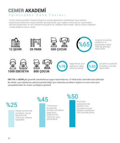 30CEMER AKADEM%u0130E%u011flenceden Daha Fazlas%u0131Cemer olarak %u00e7ocuklar%u0131n fiziksel, bili%u015fsel ve sosyal geli%u015fimlerini destekleyen oyun alanlar%u0131 tasarlamay%u0131 kendimize misyon edindik. Bu do%u011frultuda, oyun de%u011ferini art%u0131rmak i%u00e7in saha testleri, bilimsel ara%u015ft%u0131rmalar ve veri analizlerine dayanan bir yakla%u015f%u0131m benimsedik. %u0130%u015fte bu s%u00fcrecin detaylar%u0131 ve elde etti%u011fimiz somut veriler:12 %u015eEH%u0130R 20 PARK 500 %u00c7OCUK1000 EBEVEYN 800 %u00c7OCUK%78 %30mod%u00fcler t%u0131rmanma yap%u0131lar%u0131n%u0131n ve kayd%u0131raklar%u0131n daha fazla ilgi g%u00f6rd%u00fc%u011f%u00fc tespit edildi.do%u011fa temal%u0131 oyun alanlar%u0131n%u0131n daha fazla ilgi %u00e7ekti%u011fi %u00e7ocuklar%u0131n yarat%u0131c%u0131l%u0131k seviyelerini art%u0131rd%u0131%u011f%u0131 rapor edildi.%65%25%50 %45EN1176 ve ASTM gibi g%u00fcvenlik standartlar%u0131na uygun tasar%u0131mlar%u0131m%u0131z, 15 farkl%u0131 kriter %u00fczerinden test edilmi%u015ftir. Bu testler, oyun alanlar%u0131n%u0131n yaln%u0131zca g%u00fcvenli de%u011fil, ayn%u0131 zamanda %u00e7ocuklar%u0131n %u00f6zg%u00fcrce ve uzun s%u00fcre oyun oynayabilecekleri bir ortam sundu%u011funu g%u00f6sterdi.Grup oyun istasyonlar%u0131nda ge%u00e7irilen s%u00fcre, %u00e7ocuklar%u0131n sosyal etkile%u015fim d%u00fczeylerini %50 oran%u0131nda art%u0131rd%u0131.Temal%u0131 oyun gruplar%u0131nda oynayan %u00e7ocuklar%u0131n hayal g%u00fcc%u00fc kullan%u0131m%u0131nda %45%u2019lik bir art%u0131%u015f g%u00f6zlemlendi.Denge oyunlar%u0131nda %u00e7ocuklar%u0131n, denge becerilerinde %25%u2019lik bir iyile%u015fme kaydedildi.